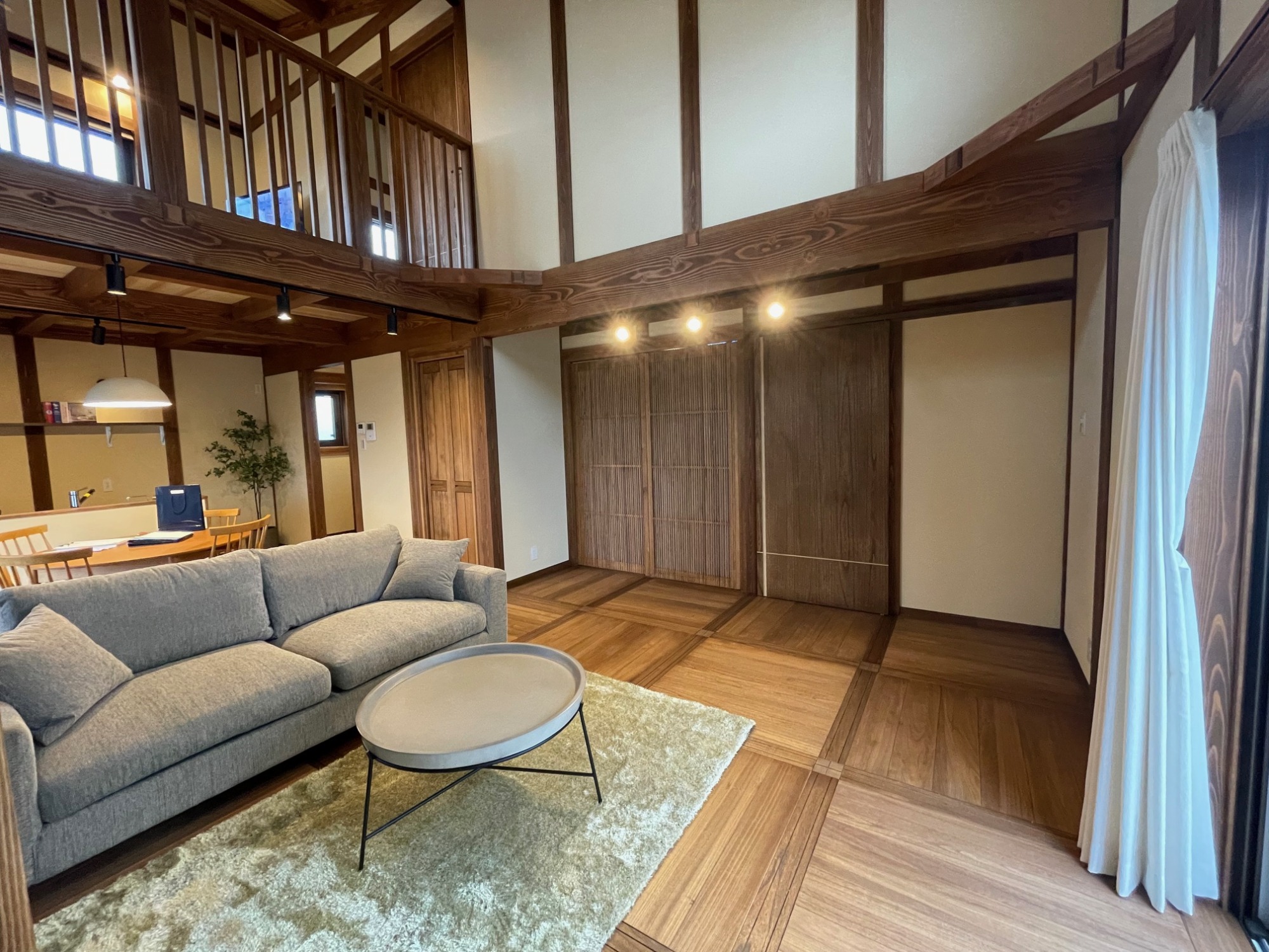 玄関ホールから入ると真っ先に目に入る吹き抜け天井が開放的なリビング。