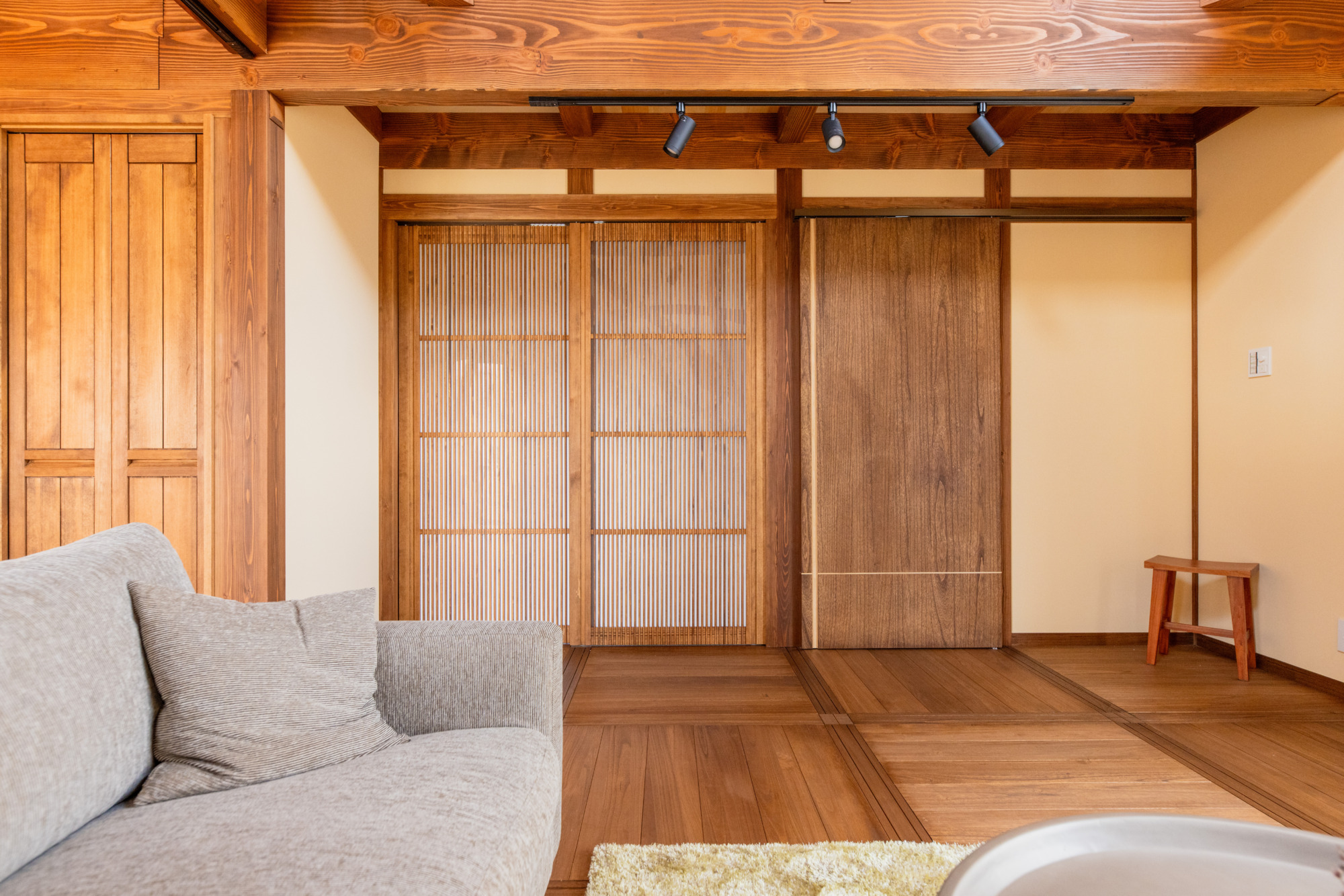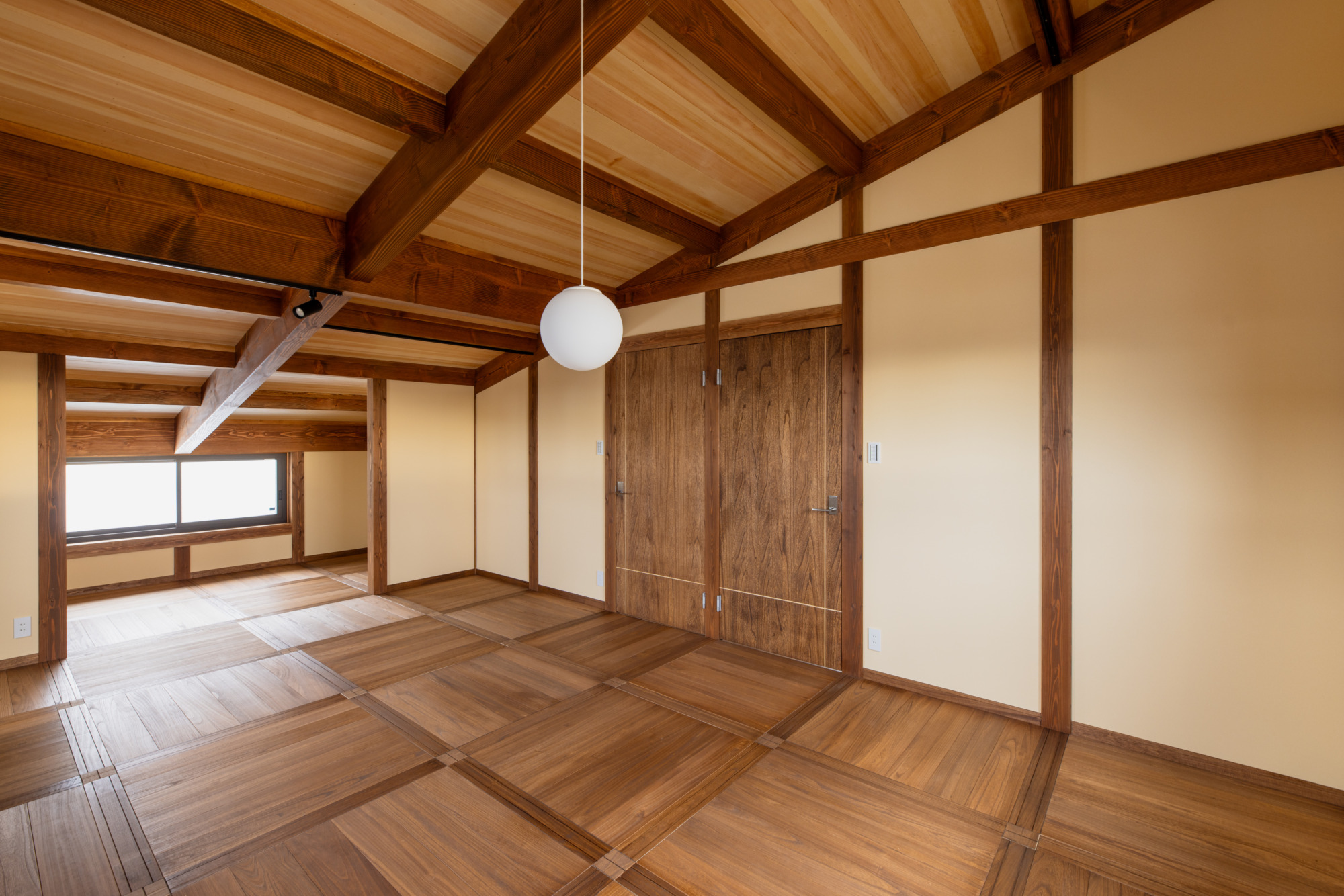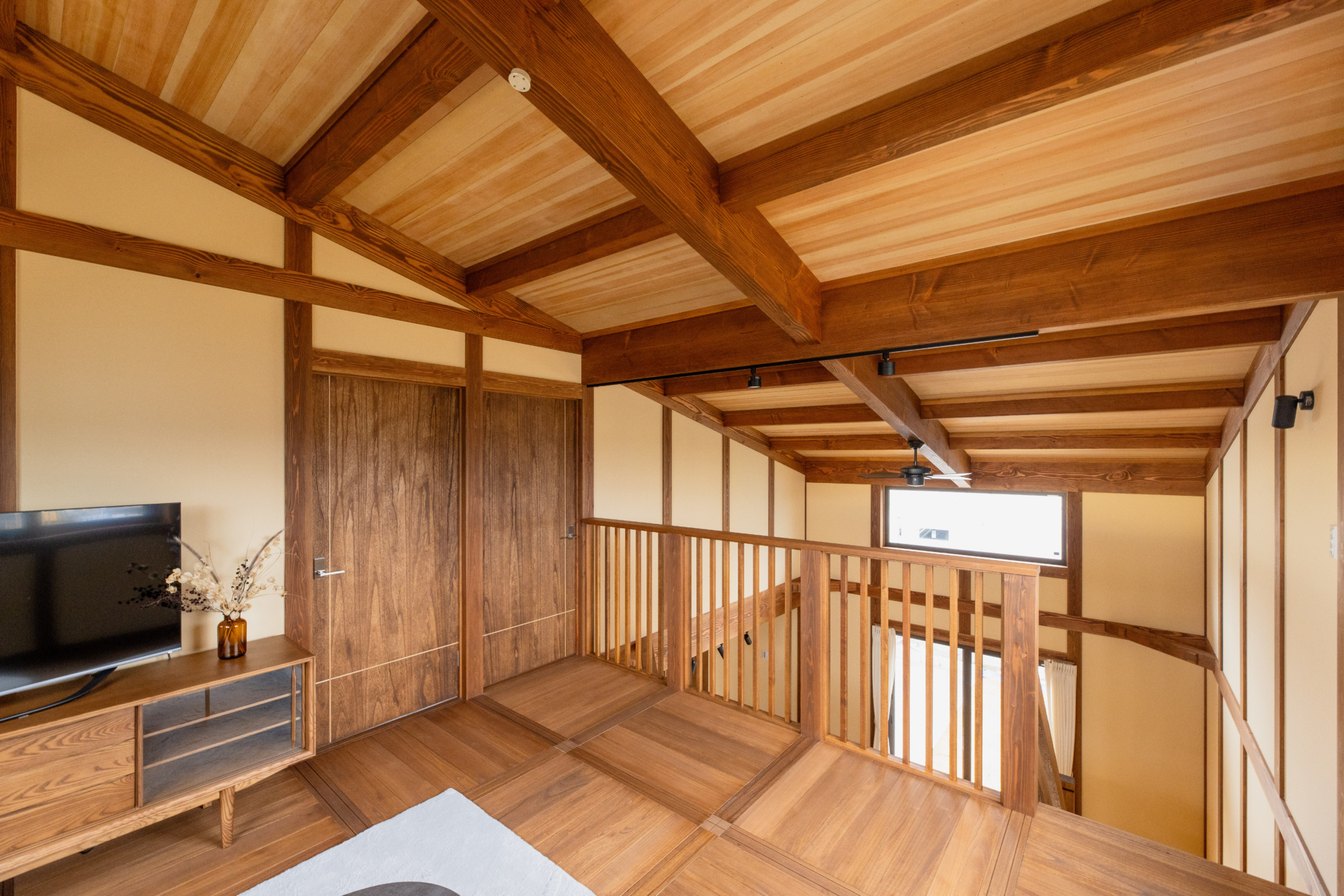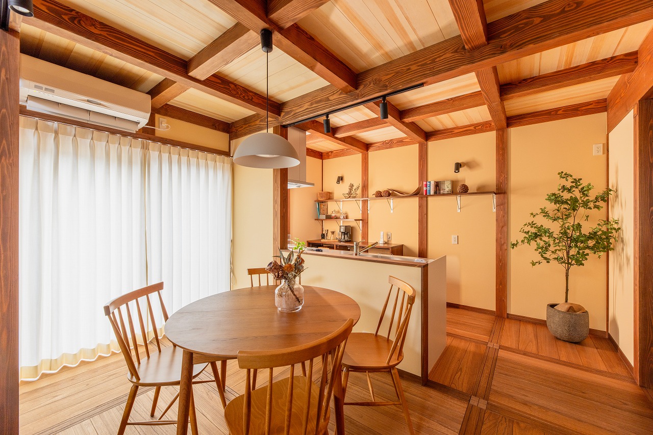 どこか懐かしい柱や梁をみせる真壁工法と、1.5階ロフトスタイルの開放感が混ざり合い、