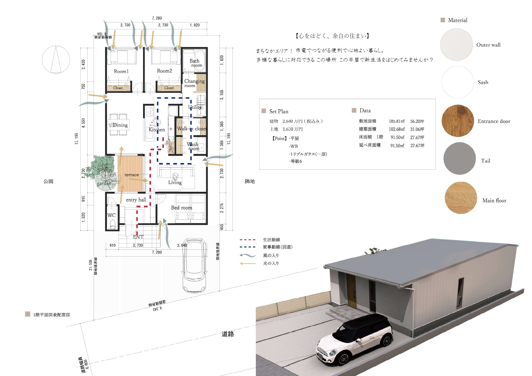 延べ床面積:91.50㎡ 27.67坪 3LDK 木造鋼板葺平屋建て【通気断熱WB工法】