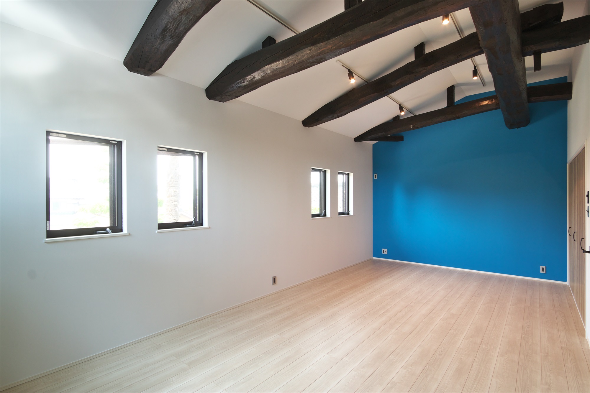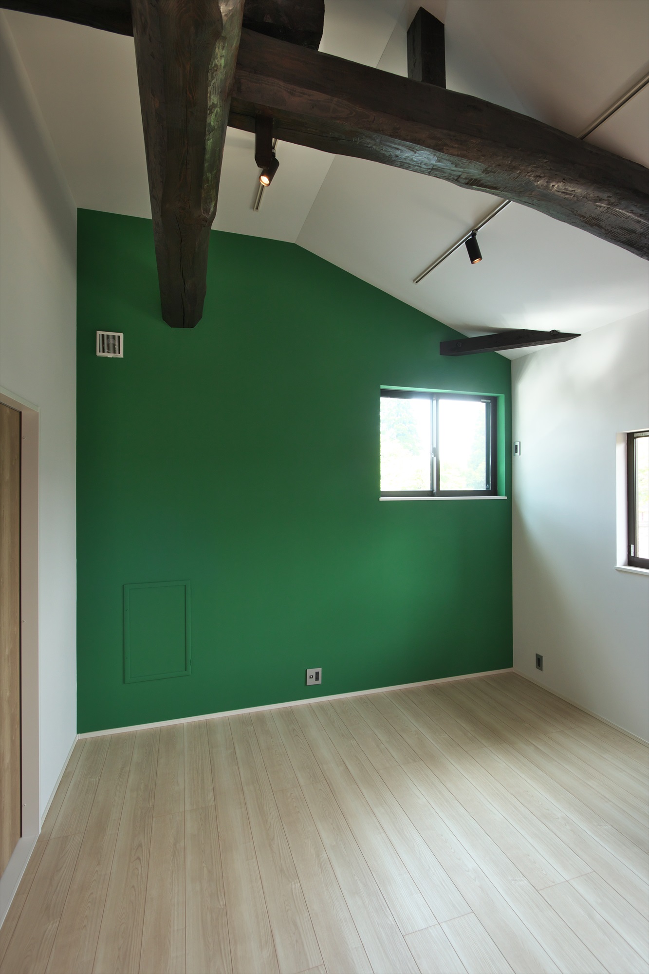 今はお子様がおひとりですが、将来のお子様のために仕切れる子供部屋を作りました。 既存の梁をそのまま生かすことで天井が高く、広がりのある空間が実現しました。 仕切った後のことを想定して、それぞれの正面の壁は、青と緑に貼り分けをし、今にも子供たちの笑い声が聞こえてきそうな楽しい空間になりました。