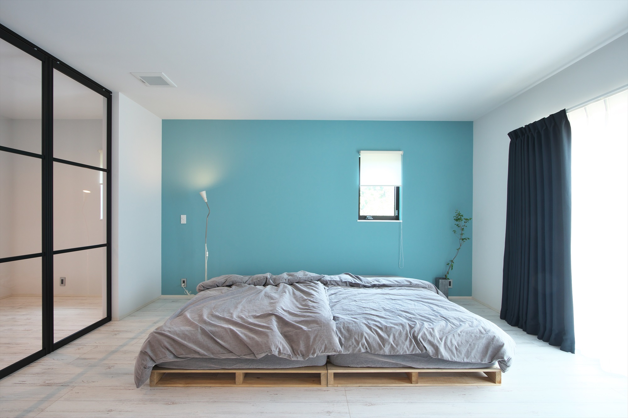 眠りの空間である壁面を1面水色で仕上げ、空間の中に違った印象を持たせています。ファブリックは無地のものを選びすっきりとまとめました。
