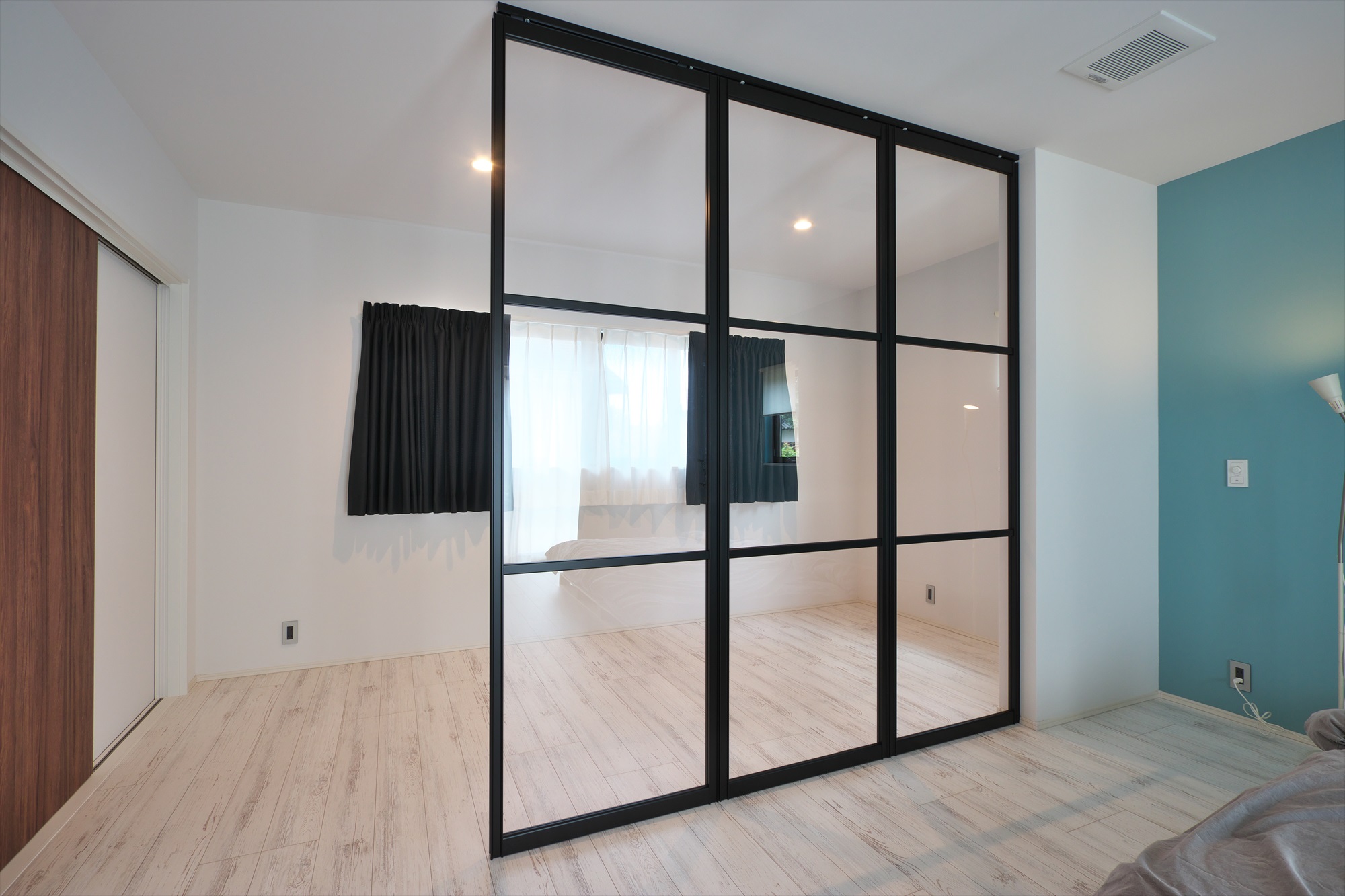 眠りの空間と、くつろぎの空間をガラスのパーティションで仕切りました。床材はホワイトオーク柄を選び、木目が生きるダークブラウンの室内ドアとの調和を大切にしました。色を変えても木目の調和を整えることで一体感のある仕上がりです。