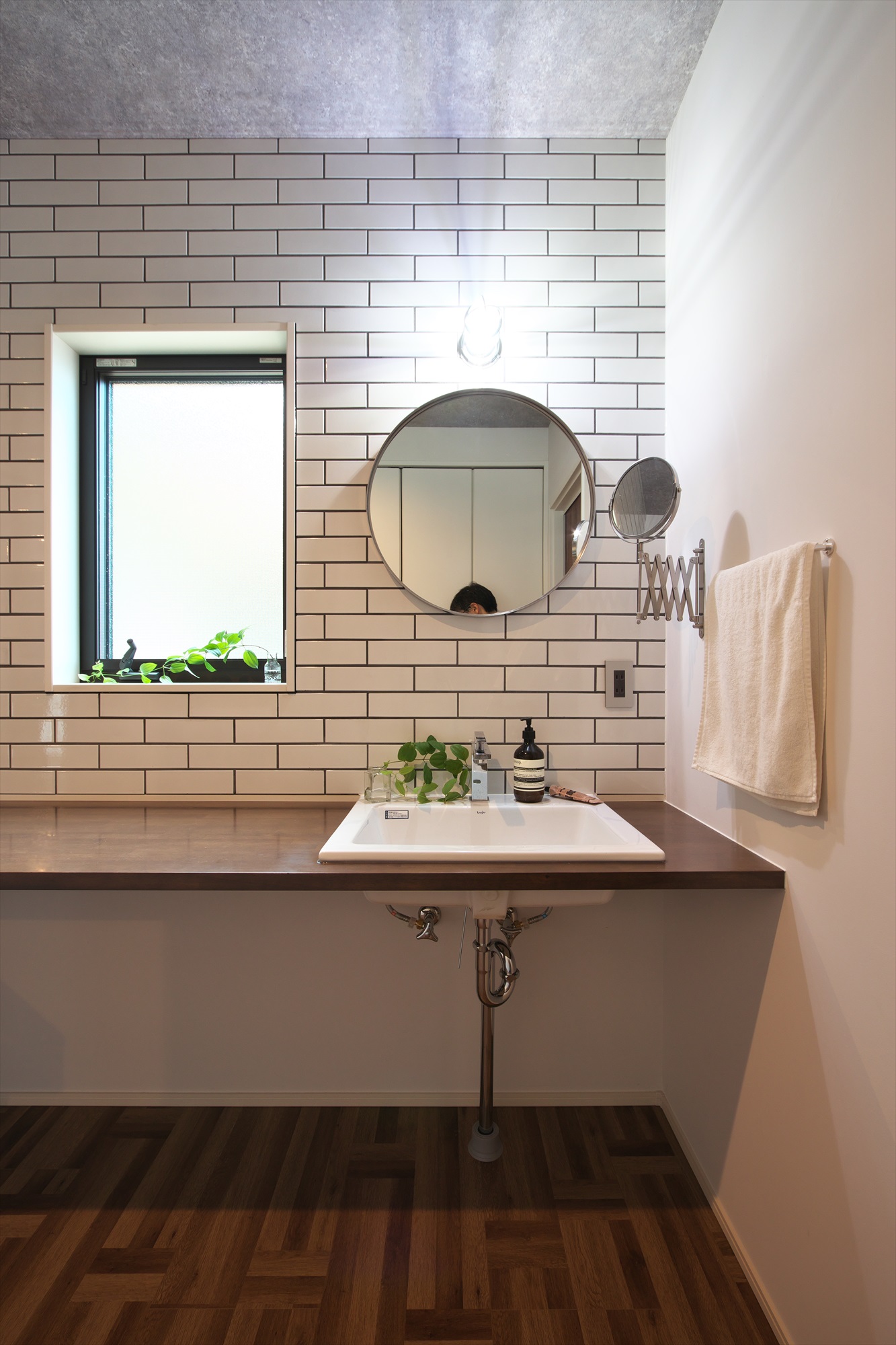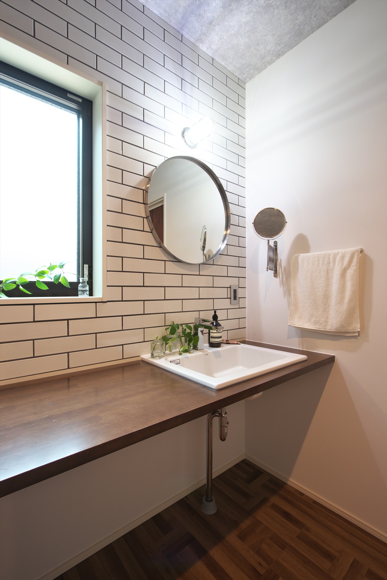壁面にアイボリーのタイルや丸形の鏡など細部にこだわった洗面所は、天井は打ちっぱなしコンクリートを思わせるクロスを選びミッドセンチュリースタイルを思わせる仕上がり になりました。