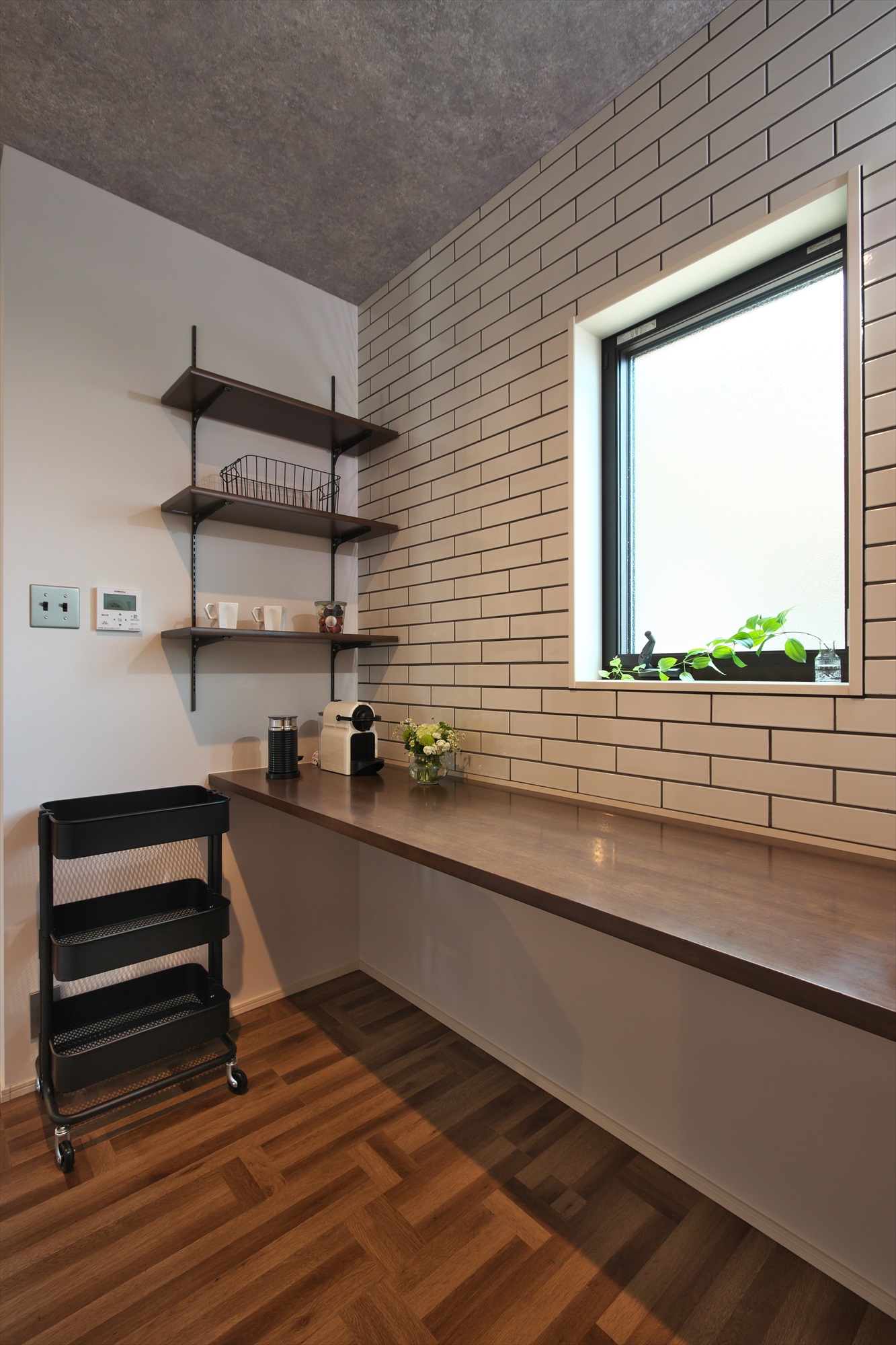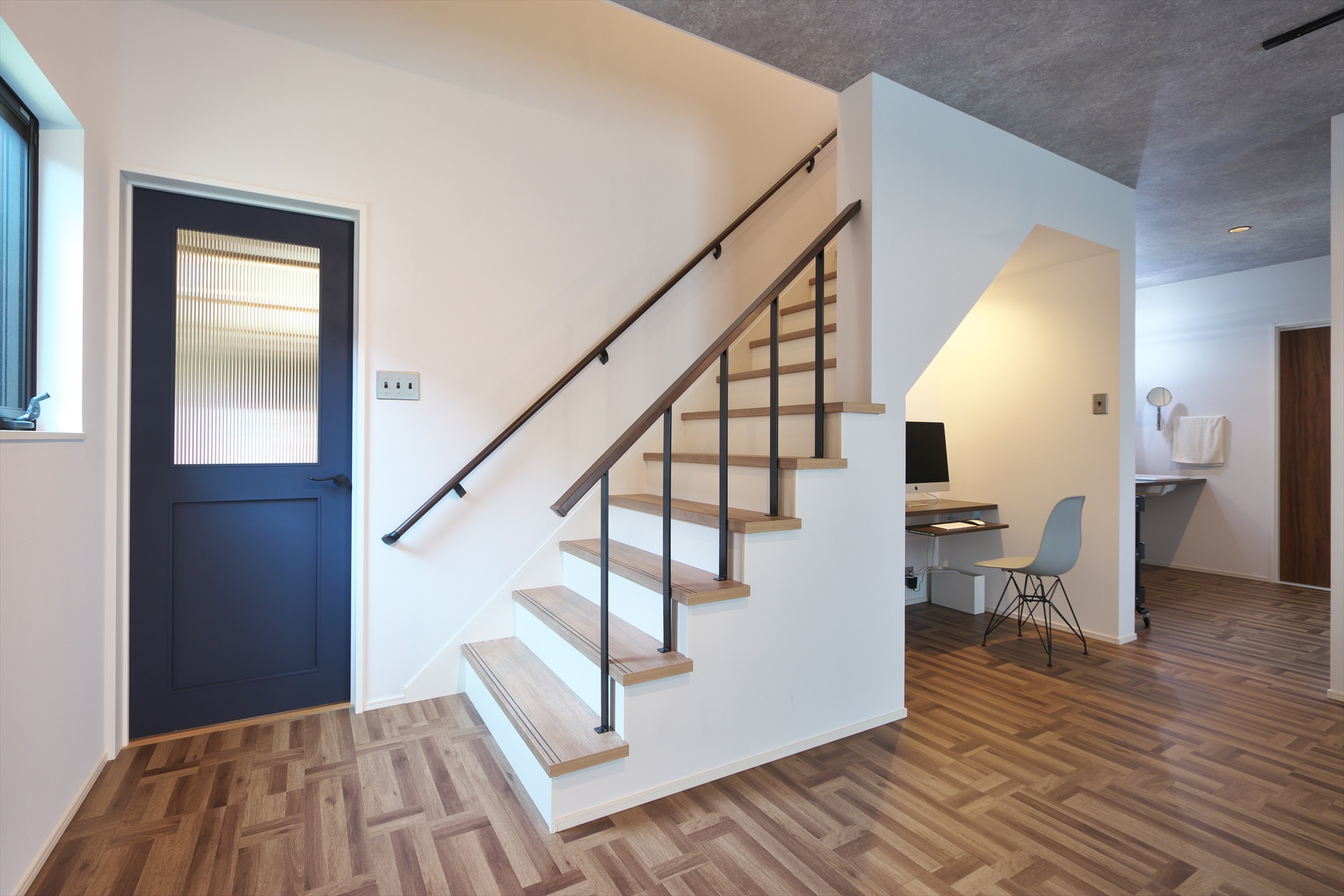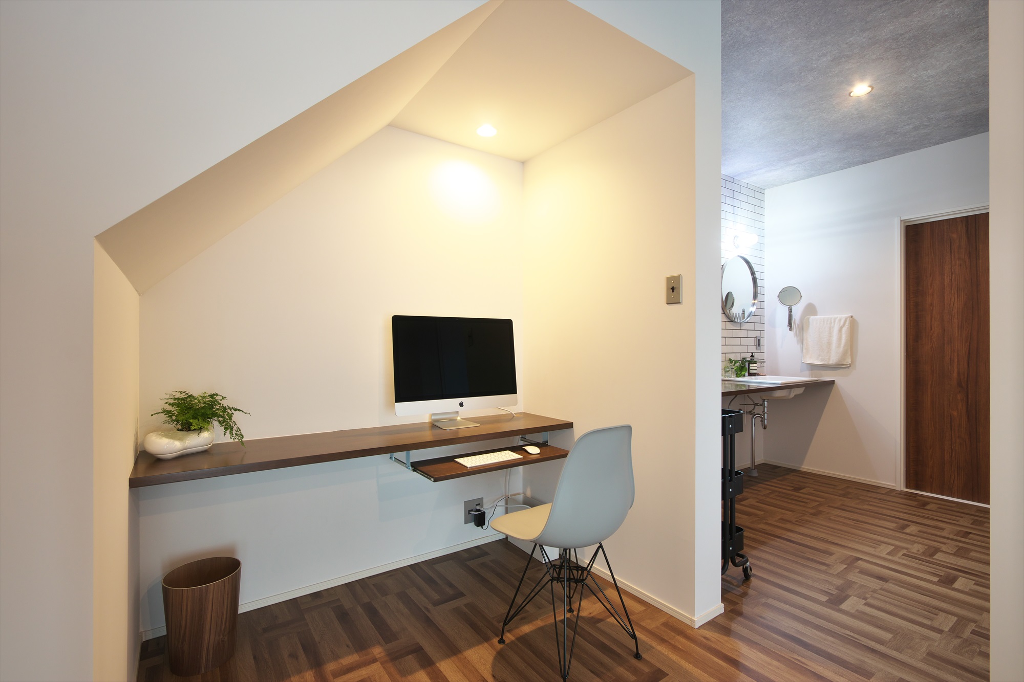 階段の下部分を活用して、書斎コーナーを設けました。 奥行が少ない棚板に、収納できるキーボード用の板を設置し、機能的でスペースに無駄のない空間ができました。