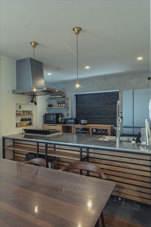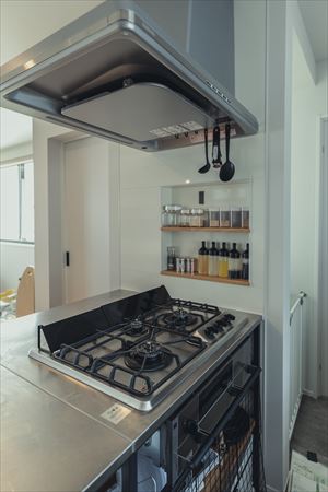 料理好きな奥様とプロの料理人のご主人がセレクトされたキッチンはやっぱりガス。 こだわりのある料理家電たちも見せる収納の中でひと際目立っています。