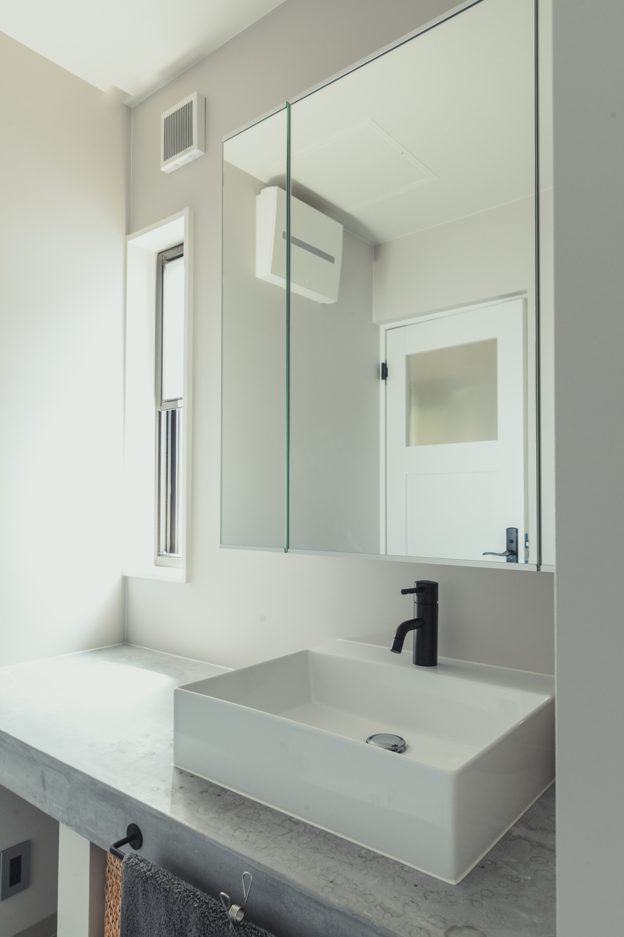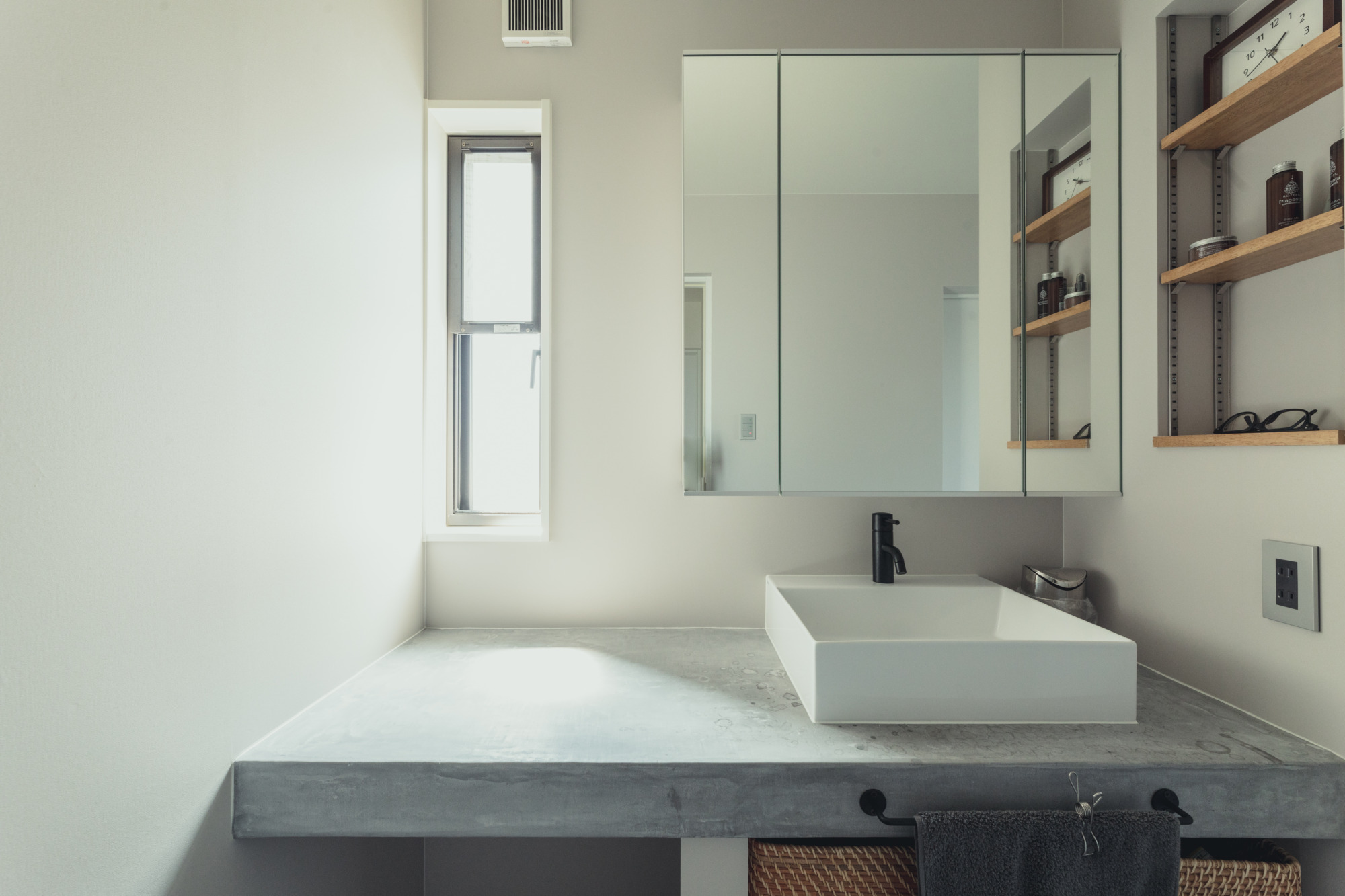 洗面のカウンターは素材を選ばないモールテックス塗装。 1mmくらい薄く塗るだけでコンクリートと同等強度があり防水性能も高い素材です。 男前インテリアにピッタリの性能も兼ね備えたデザインです。