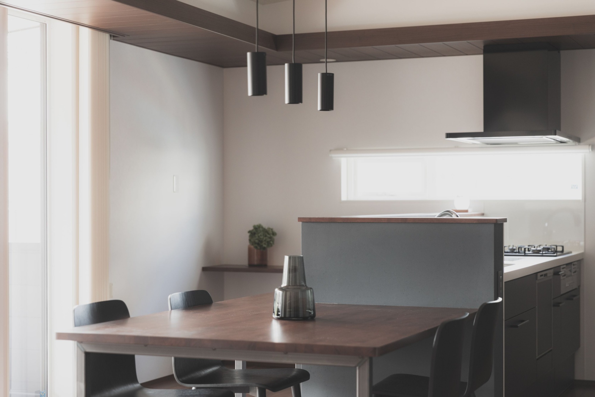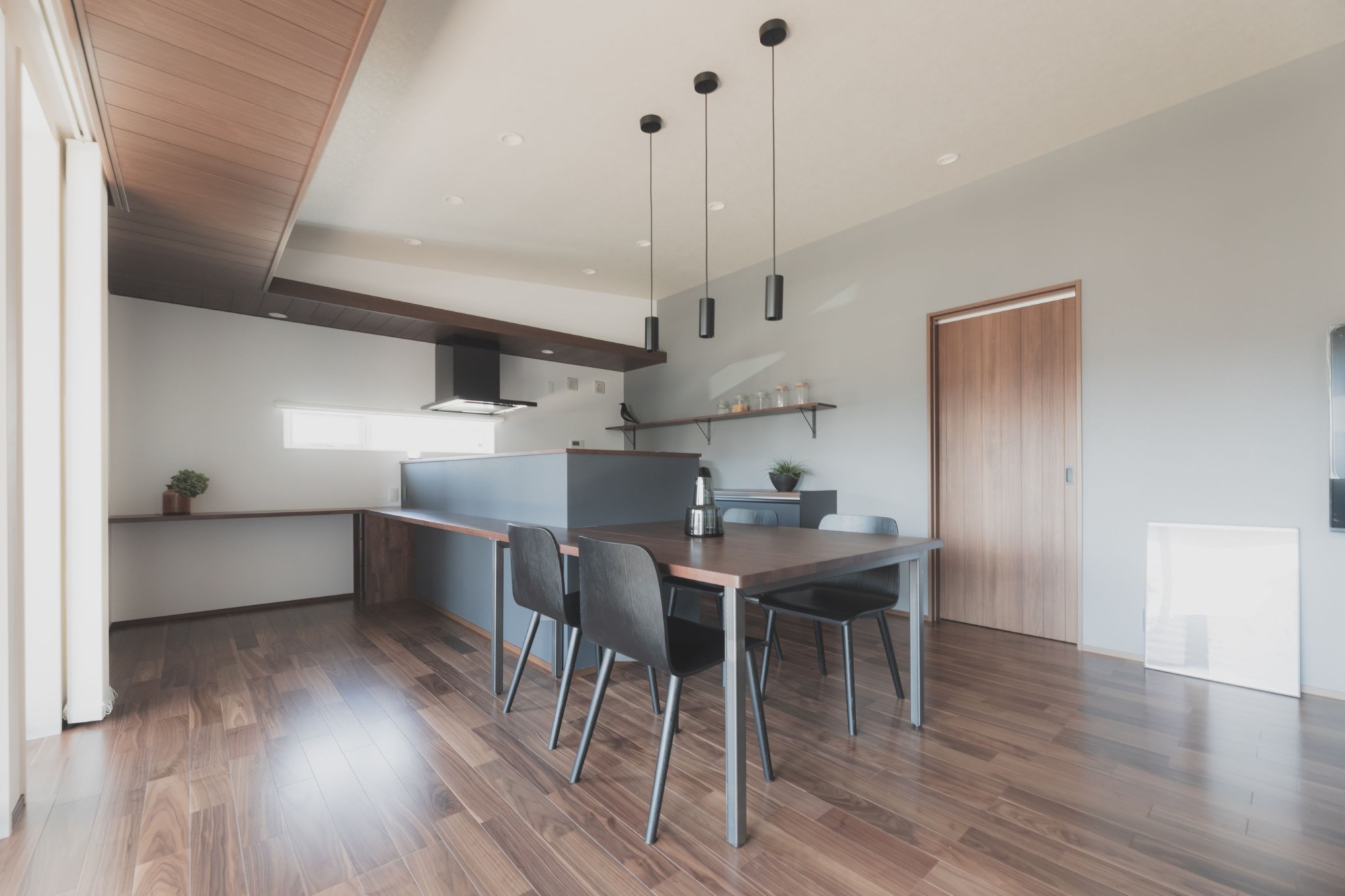 2階の広いウッドデッキから入る光はリビング全体を明るく照らしてくれます。 造作カウンターはダイニングとスタディースペースがつながっており、異なる作業をしていても邪魔にはならない十分な広さを確保しています。 晴れた昼夜はデッキにでて読書や、夕涼みができるスペース。