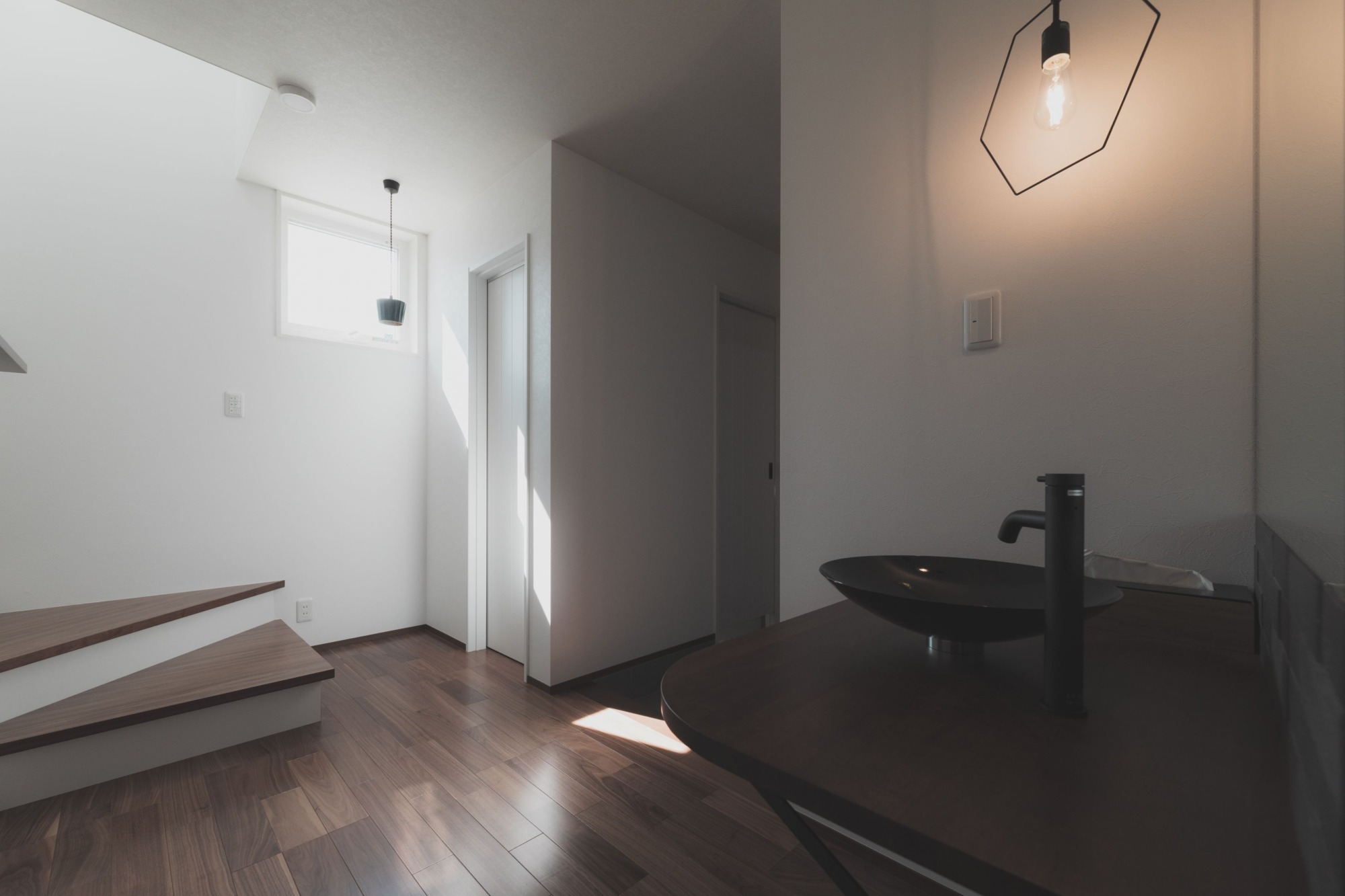 1階に水周りが集結しており、家事が1階で完結できる動線となっています。 洗う→干す→たたむ→収納の流れができており、時短につながります。 箇所ごとの照明も拘りのひとつ。