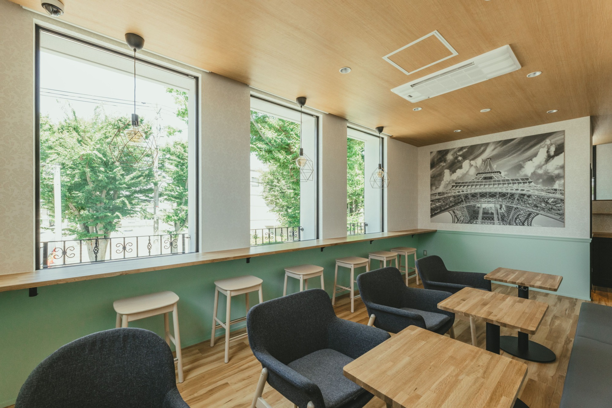 2階はイートインスペース。 ちょうど並木通りを見下ろせるように窓辺にカウンターを配置。 グループで来られた方にはテーブルスペースも。 壁面はお施主様の故郷であるフランスのエッフェル塔の写真をオーダーで作成し取付。