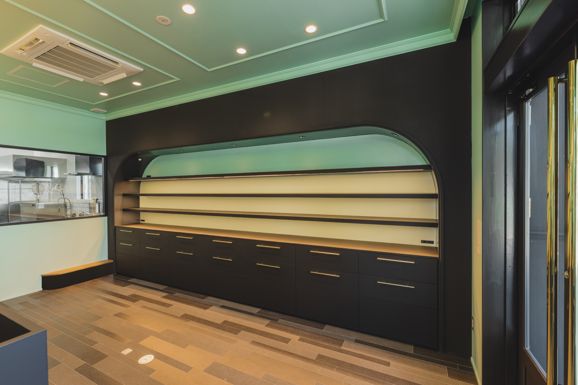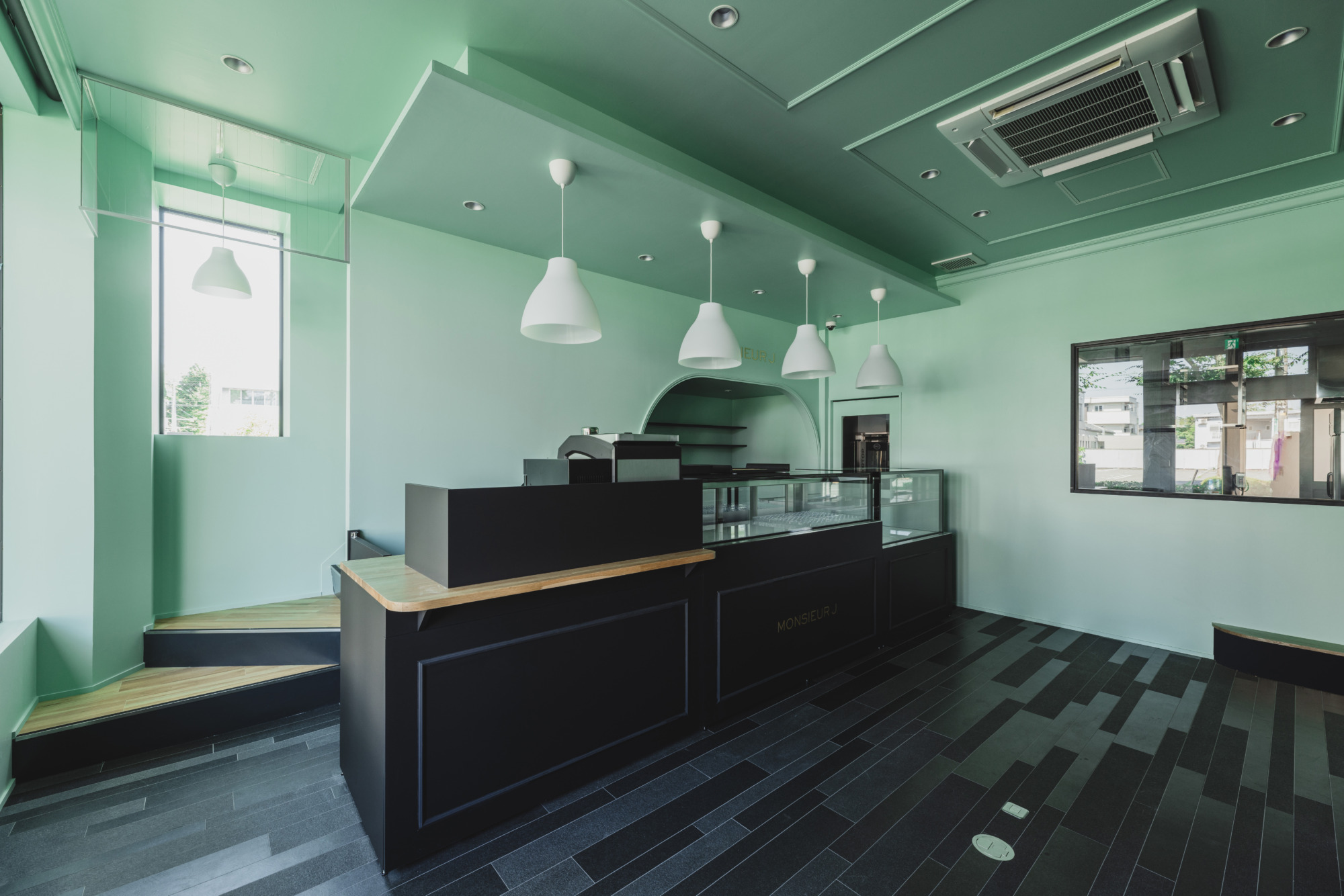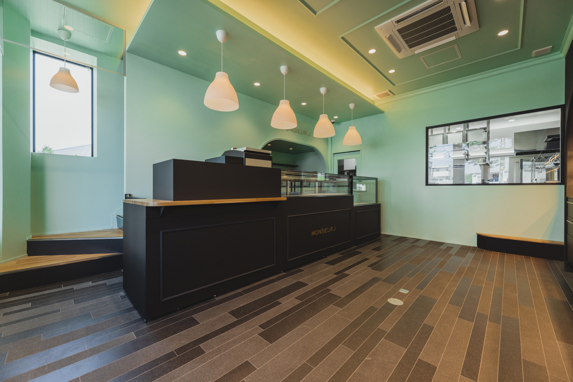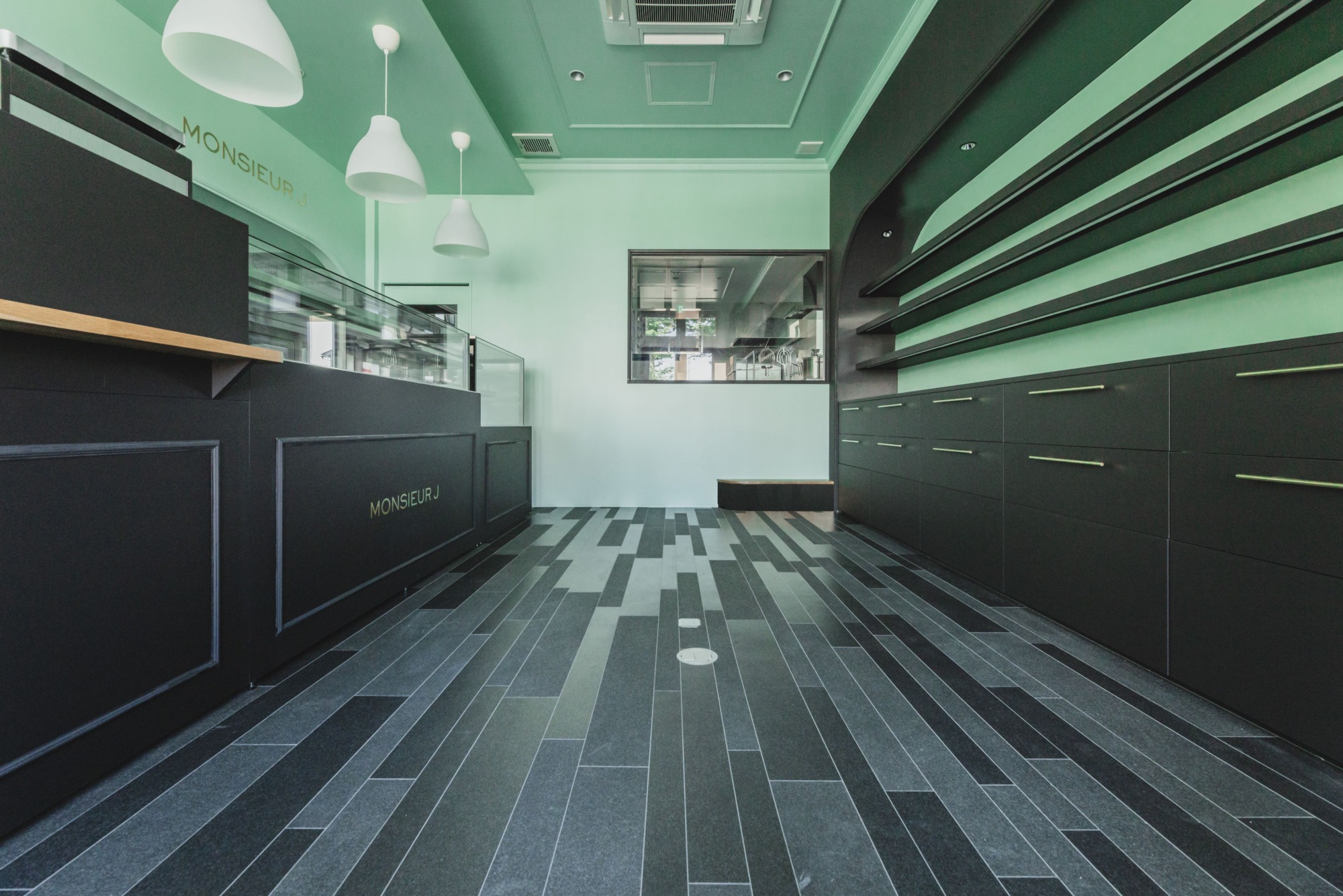 店内に入ると爽やかなグリーンと落ち着いたダークグレーが空間に広がります。 色鮮やかなマカロンや焼菓子たちが引き立つような色合いになっています。