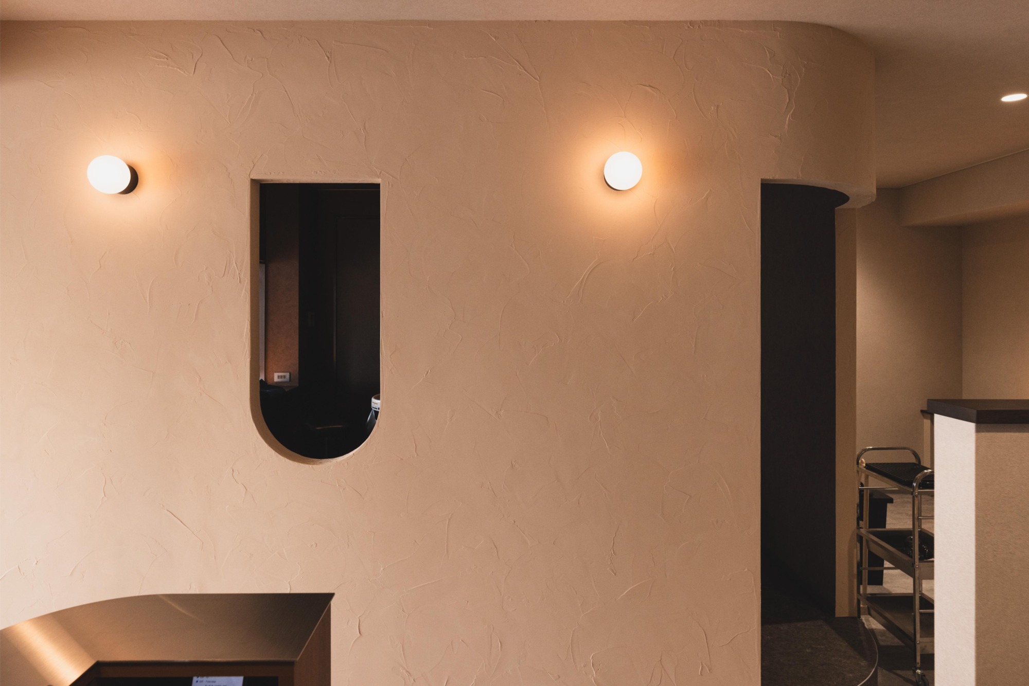 扉を開けると木の素朴な風合いと、漆喰のジンジャーカラーが調和した居心地の良い空間が広がります。