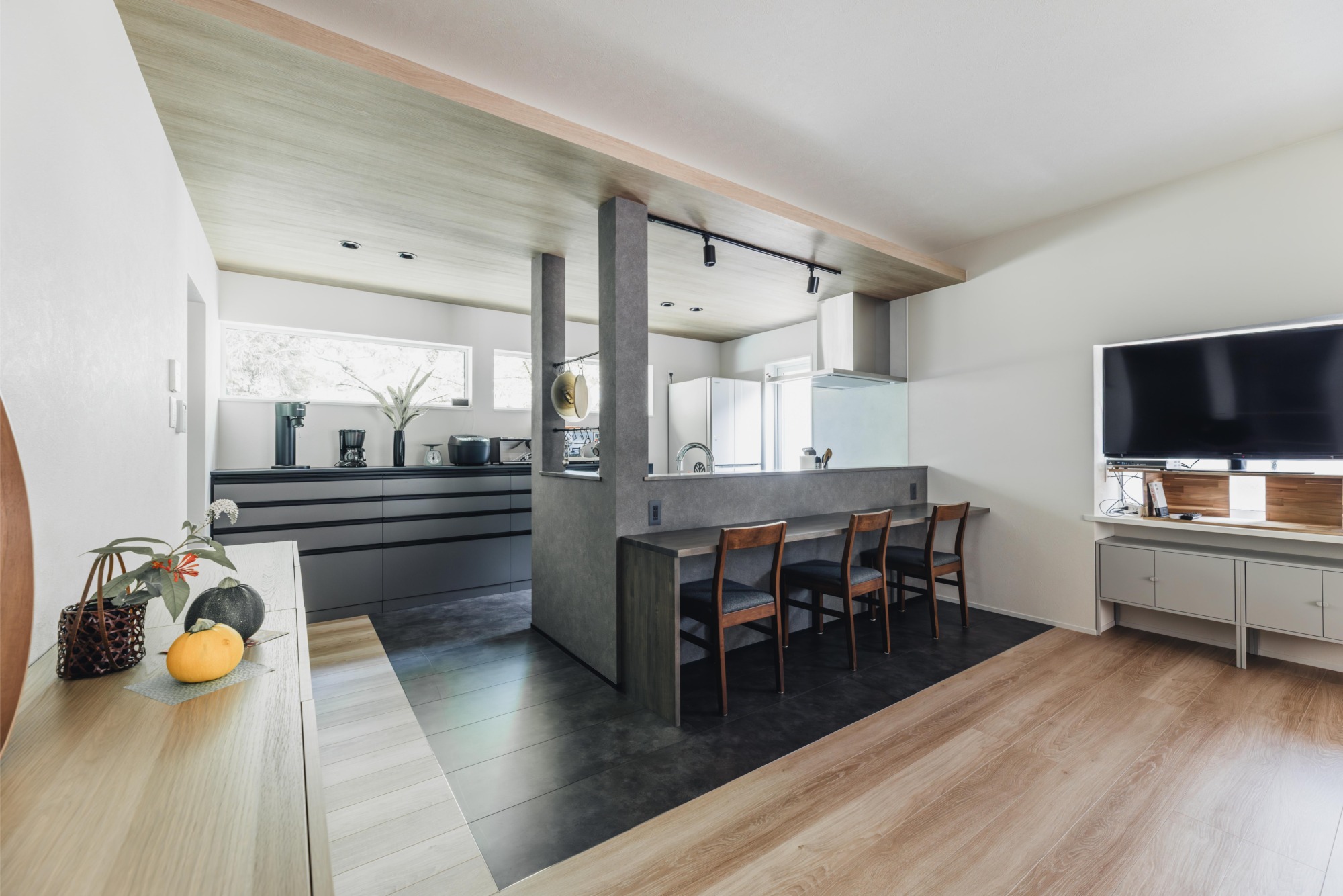 キッチンを壁付けから対面型に変更し、前面カウンターはお子さまの学習スペースとしても利用。収納力アップにより見せる収納から隠す収納へ変更し、すっきりと広々とした空間に生まれ変わりました。