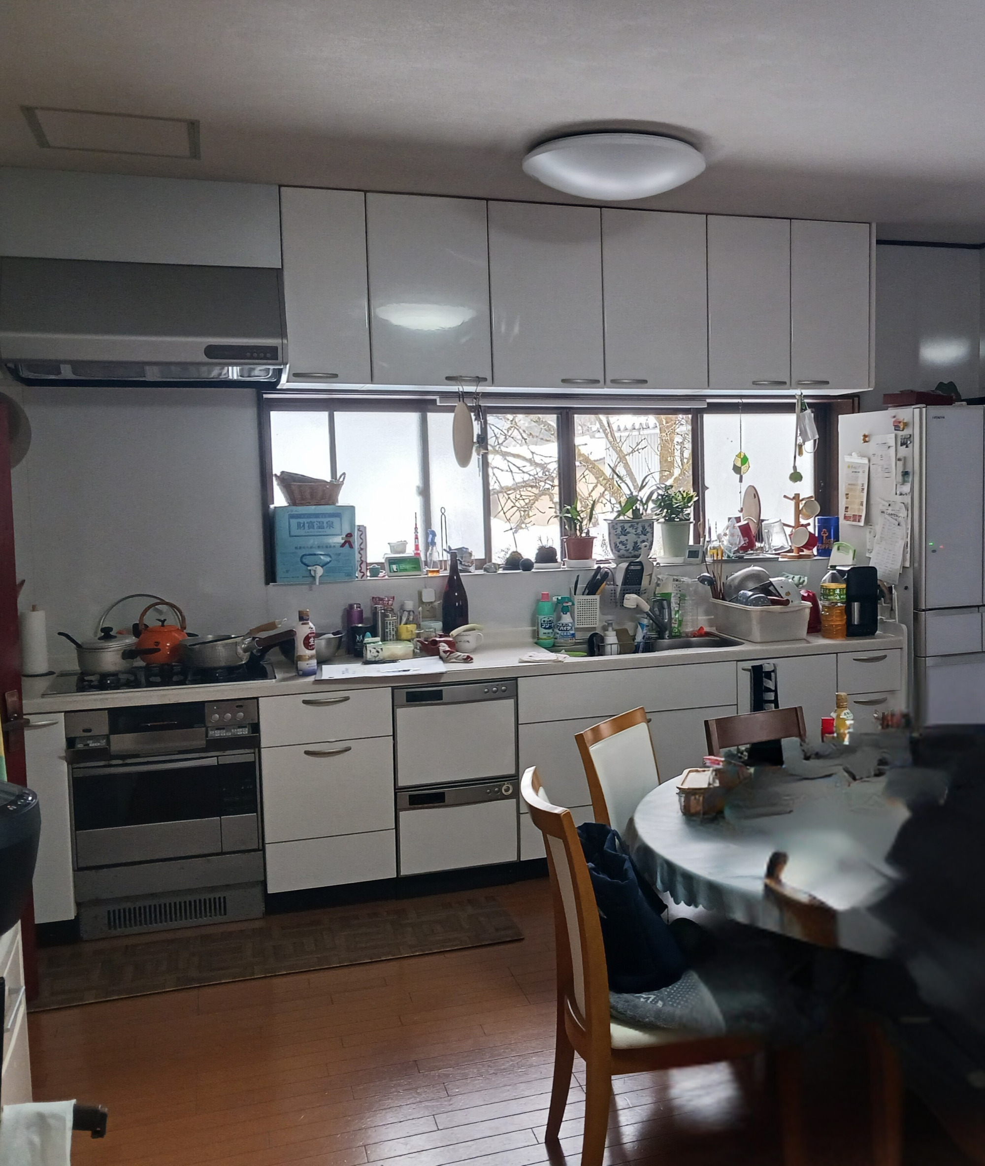 メインとなる壁面には明るく開放的な白色を採用し、機能的なキッチン空間にはモダンで上品なグレーをアクセントとして配置。この洗練されたベースカラーが、長年愛用されてきた木製家具の温もりと美しいコントラストを生み出し、新旧が融合した居心地の良い空間を演出しています。