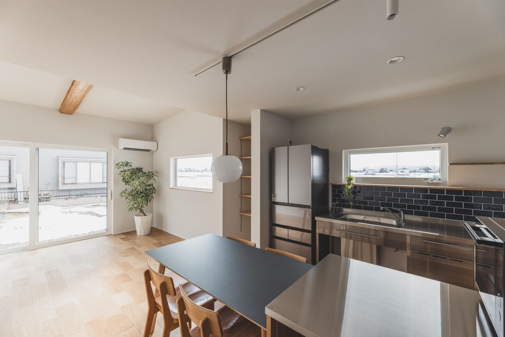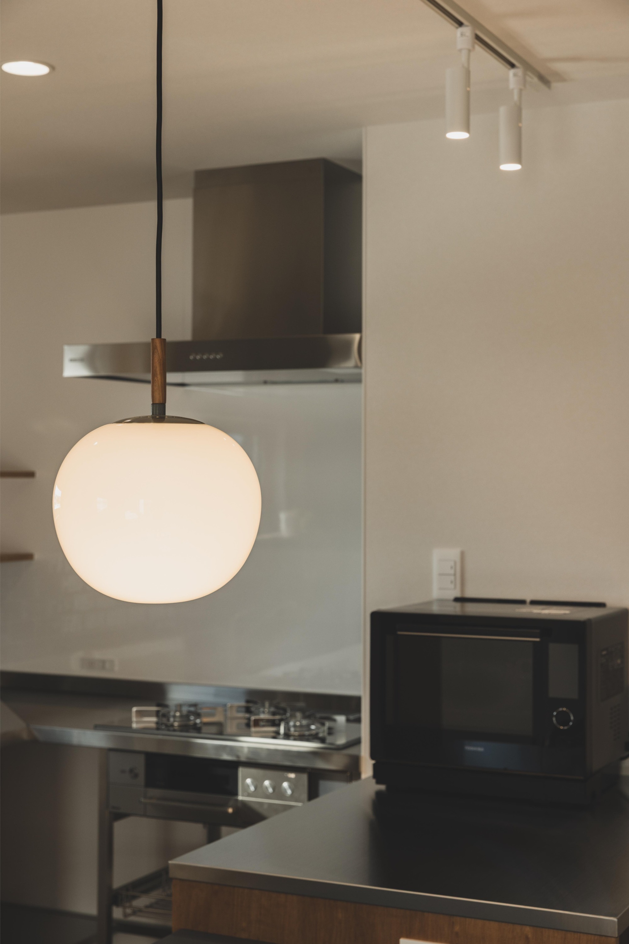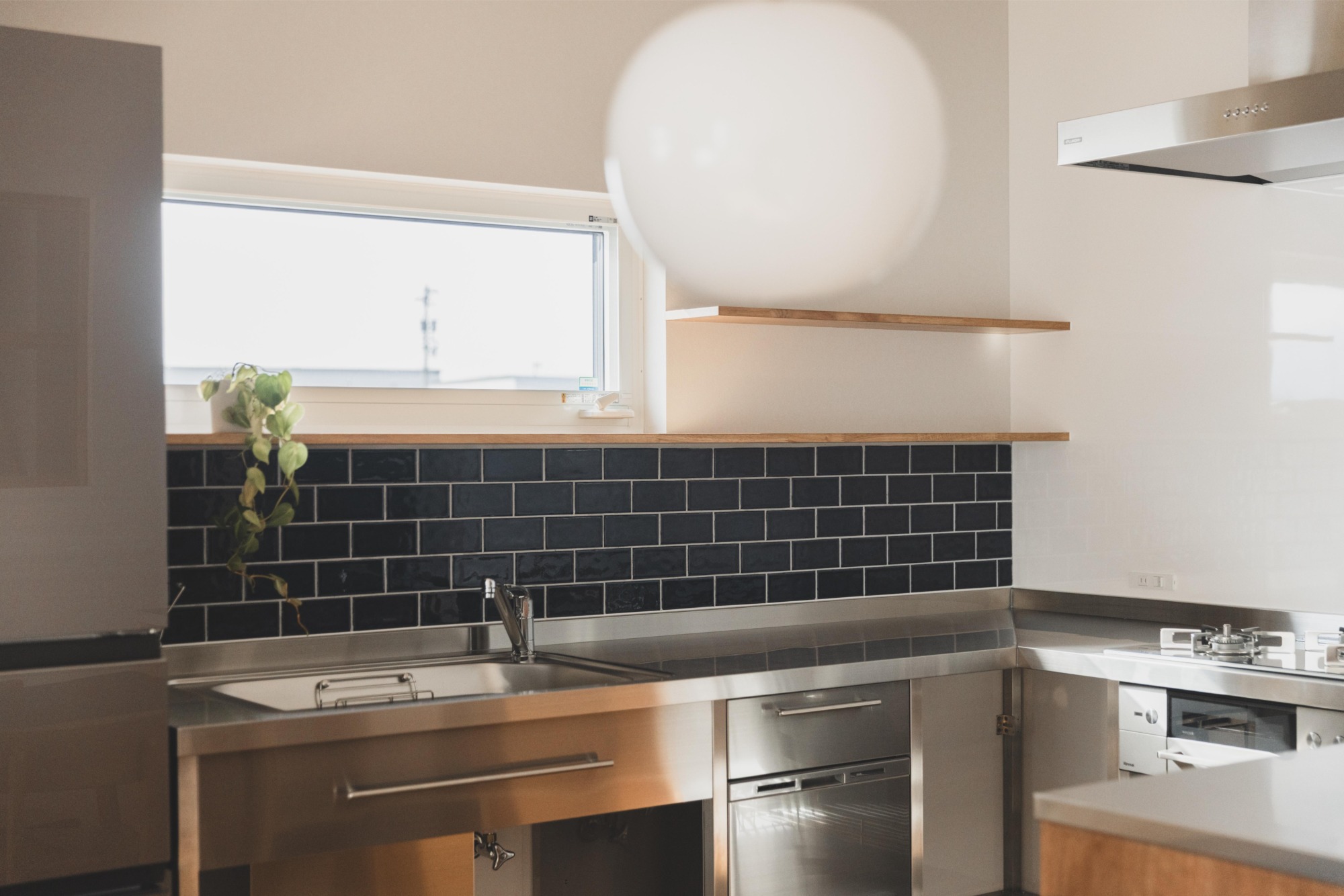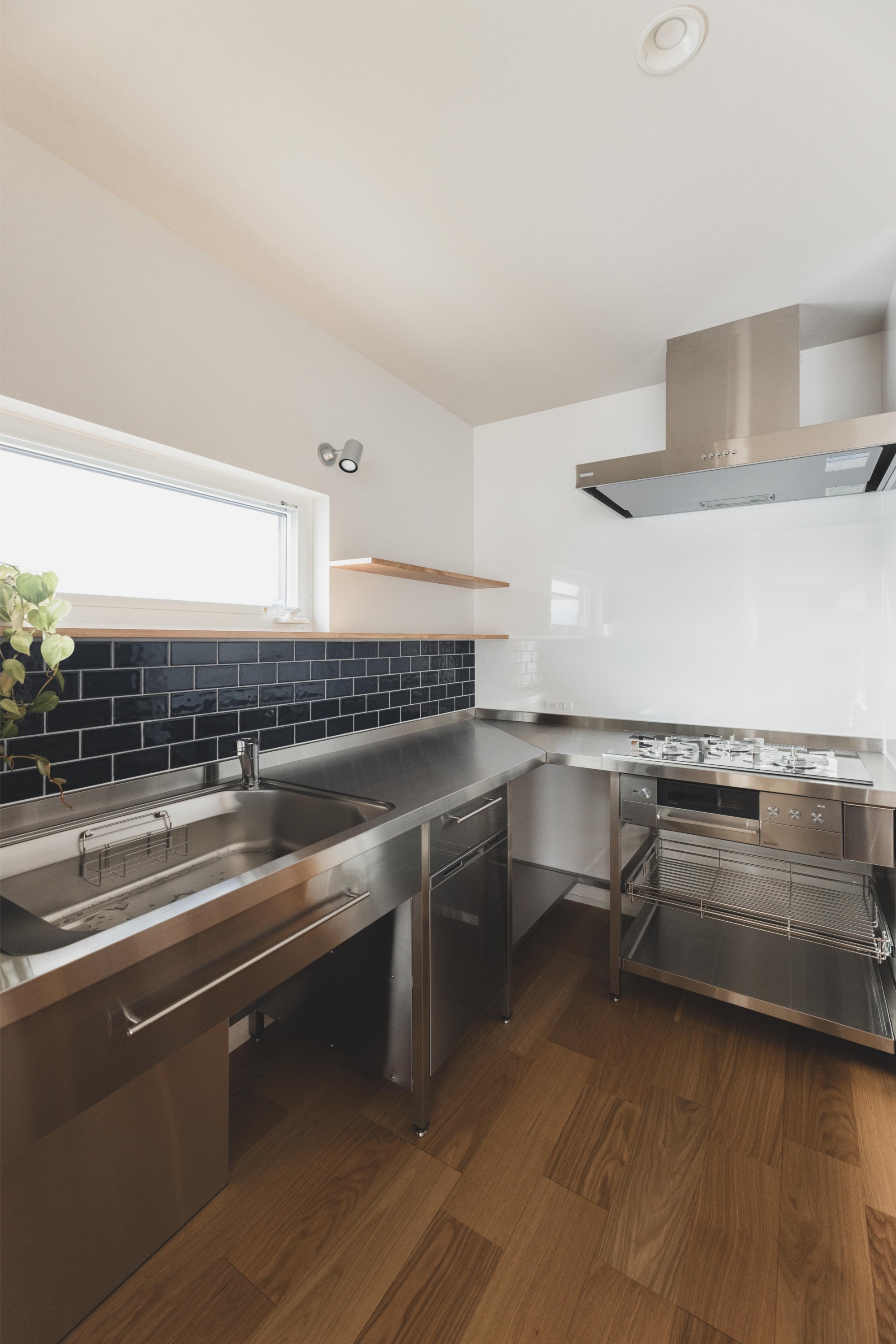 よく家族で料理をされるというキッチンは、通常のシステムキッチンではなくコの字型を採用し、作業スペースを広々と確保しました。栄養士のお母さまのご要望もあり、プロの現場でも使われるステンレス素材のキッチンを選択。清潔感があり、傷や熱にも強いステンレスは、毎日本格的に料理に向き合うご家族にとって、まさに理想的です。