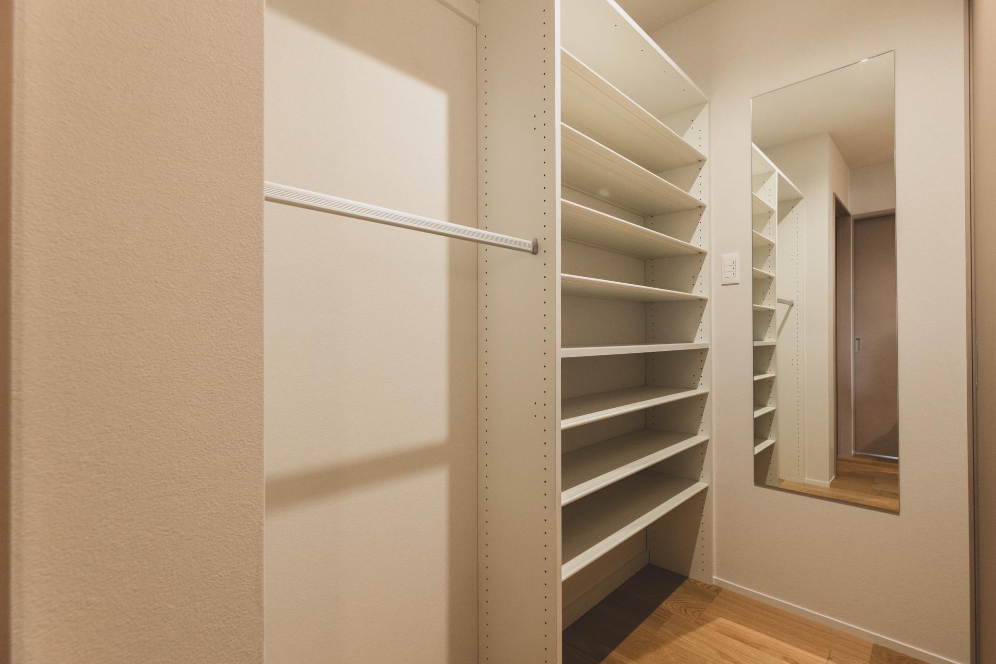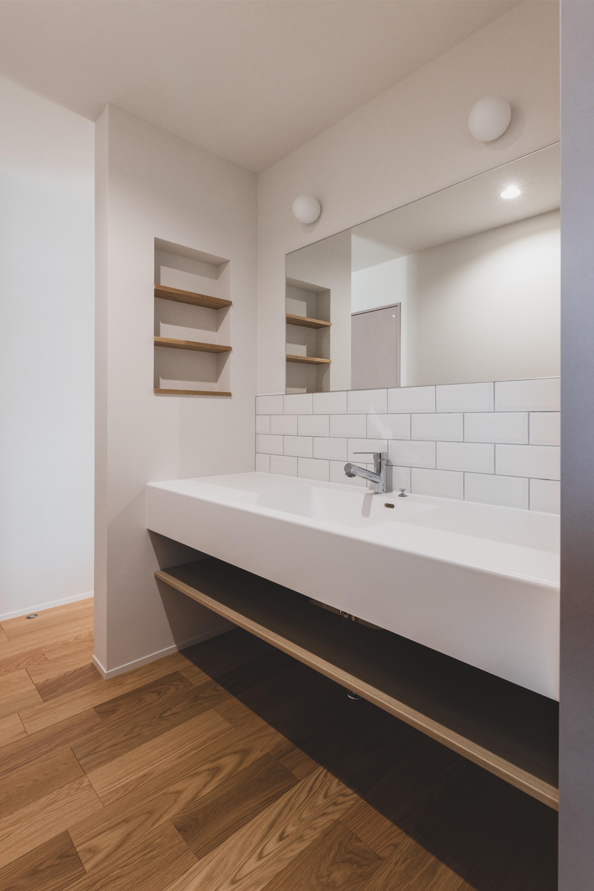 洗面スペースは、家族みんなが朝の時間を気持ちよくスタートできるよう、ゆとりある幅を確保しました。横並びで使えるワイドな洗面ボウルは、忙しい朝でも順番待ちのストレスなく、それぞれのペースで身支度を整えられます。