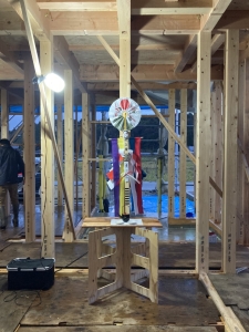 土地や建物の守護神と匠の神を祭って、これまでの工事の無事に感謝し、