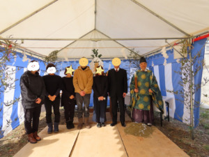 神主さんをお招きし、工事の安全と建物の繁栄を祈る旨の祝詞を奏上し、