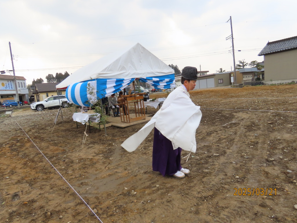 地鎮祭では、斎主による祝詞奏上、施主様による鍬入れの儀、そして参列者全員での玉串奉奠など、厳粛かつ滞りなく儀式を執り行うことができました。
