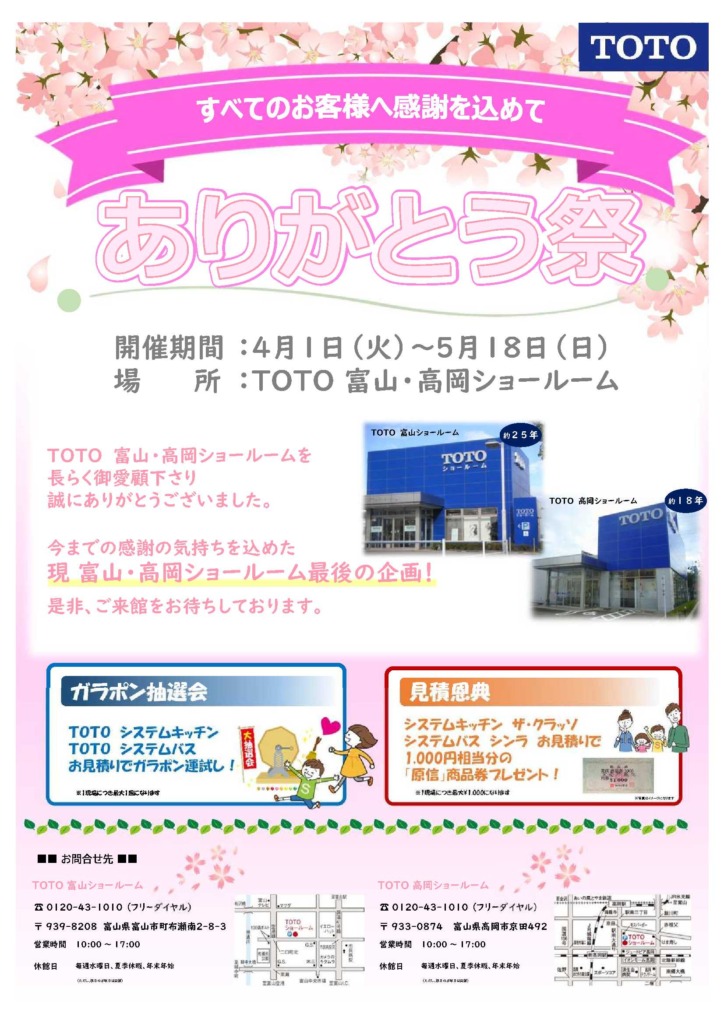 TOTO富山ショールームとTOTO高岡ショールームは統合し、5月29日(木)から新しいショールーム(高木西)に移転オープンします。