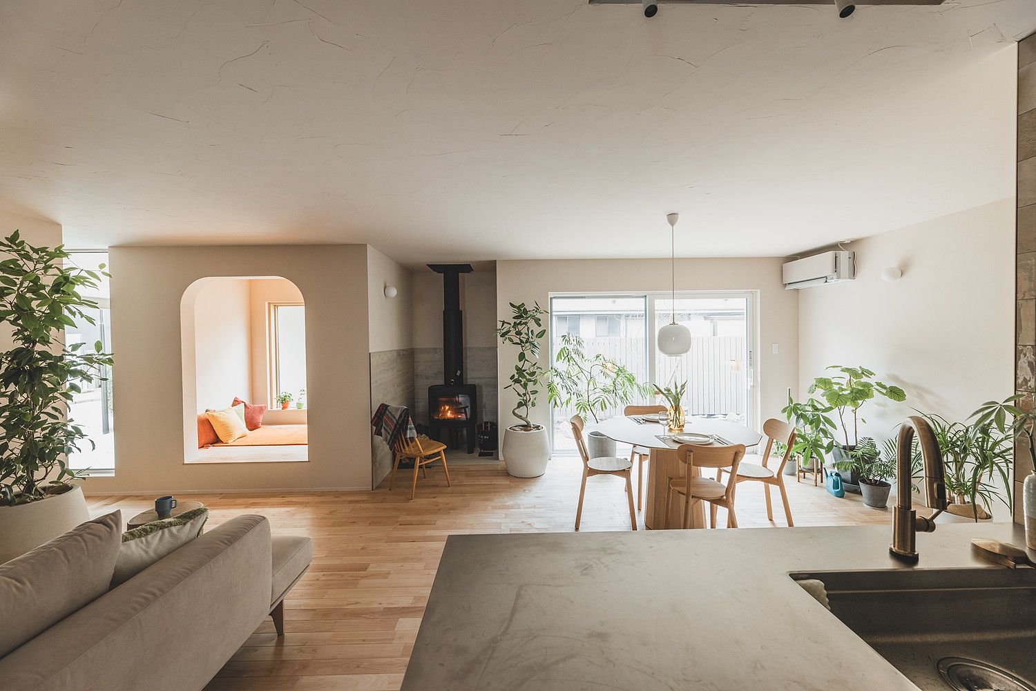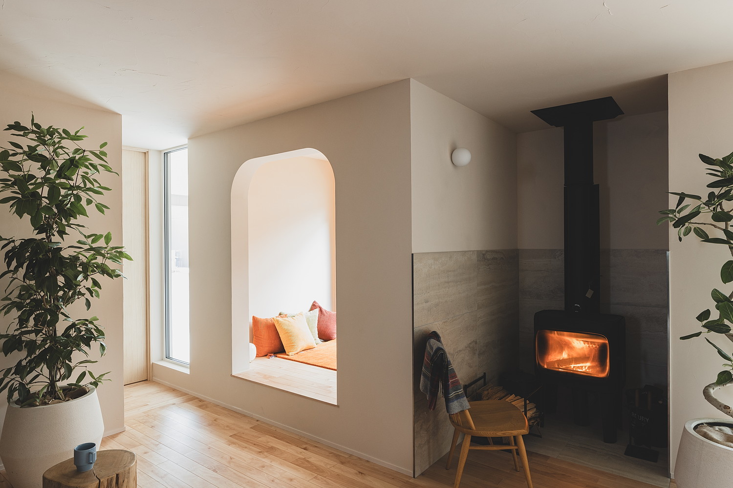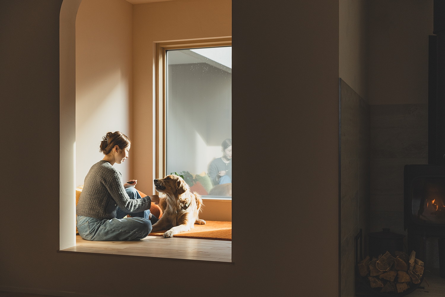 大きな窓から入る光、木の床のやわらかな触れ心地、火を囲む時間。