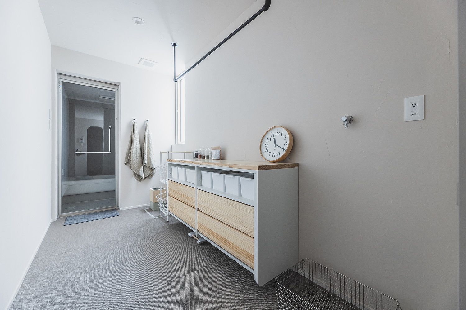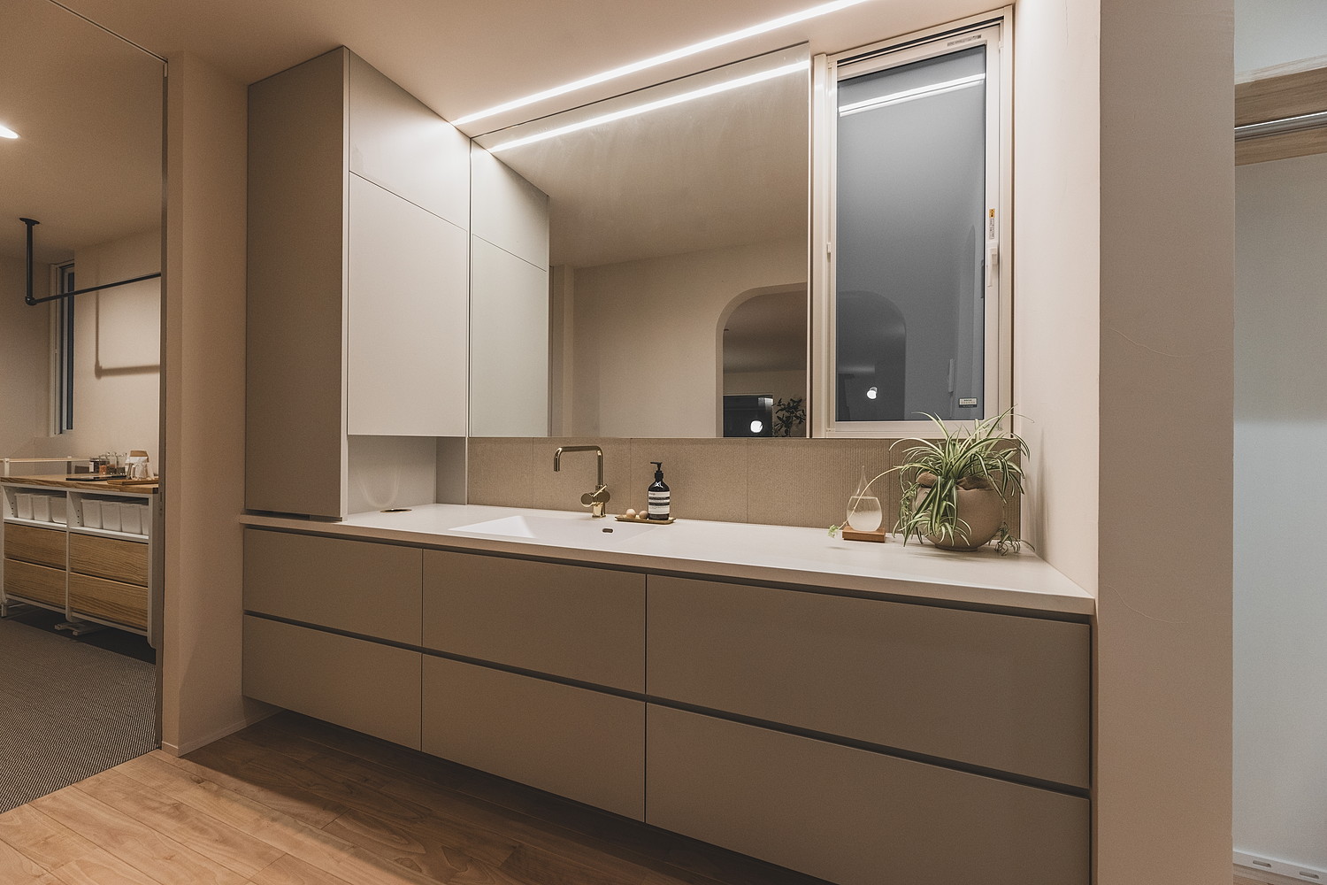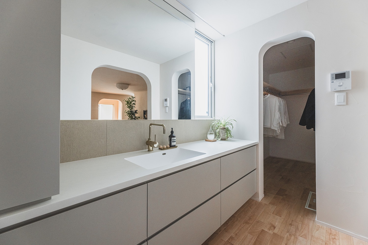 リビングから扉を設けず、アーチを抜けた先に広がる清潔感あふれる洗面空間。左右にはランドリーとWICを直線的に配置した家事ラク動線。ヌックから差し込む光が鏡越しに広がります。