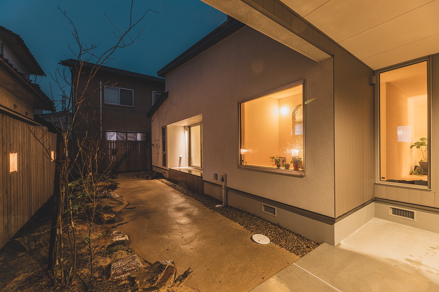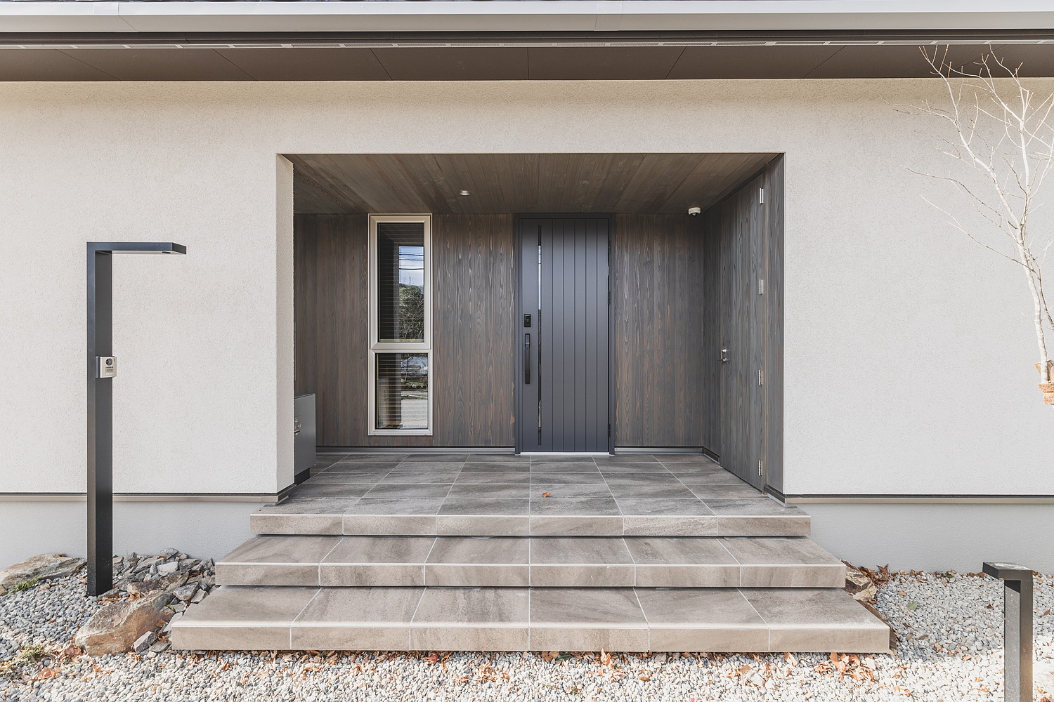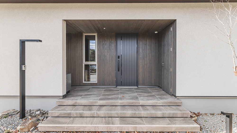 正面のファサードはジョリパット吹付で仕上げ、玄関ポーチ部分には温かみのある杉羽目板を張りました。側面にも同様の羽目板を施し、外部収納スペースとして実用性も兼ね備えています。広々としたエントランスには宅配ボックスも設置されており、インナーガレージから直接玄関へアクセスできる動線とあわせて、雨天時も濡れることなく荷物の受け取りや出入りが快適に行えます。夜になるとポーチと庭の照明が優しく灯り、昼間とはまた異なる表情を見せます。