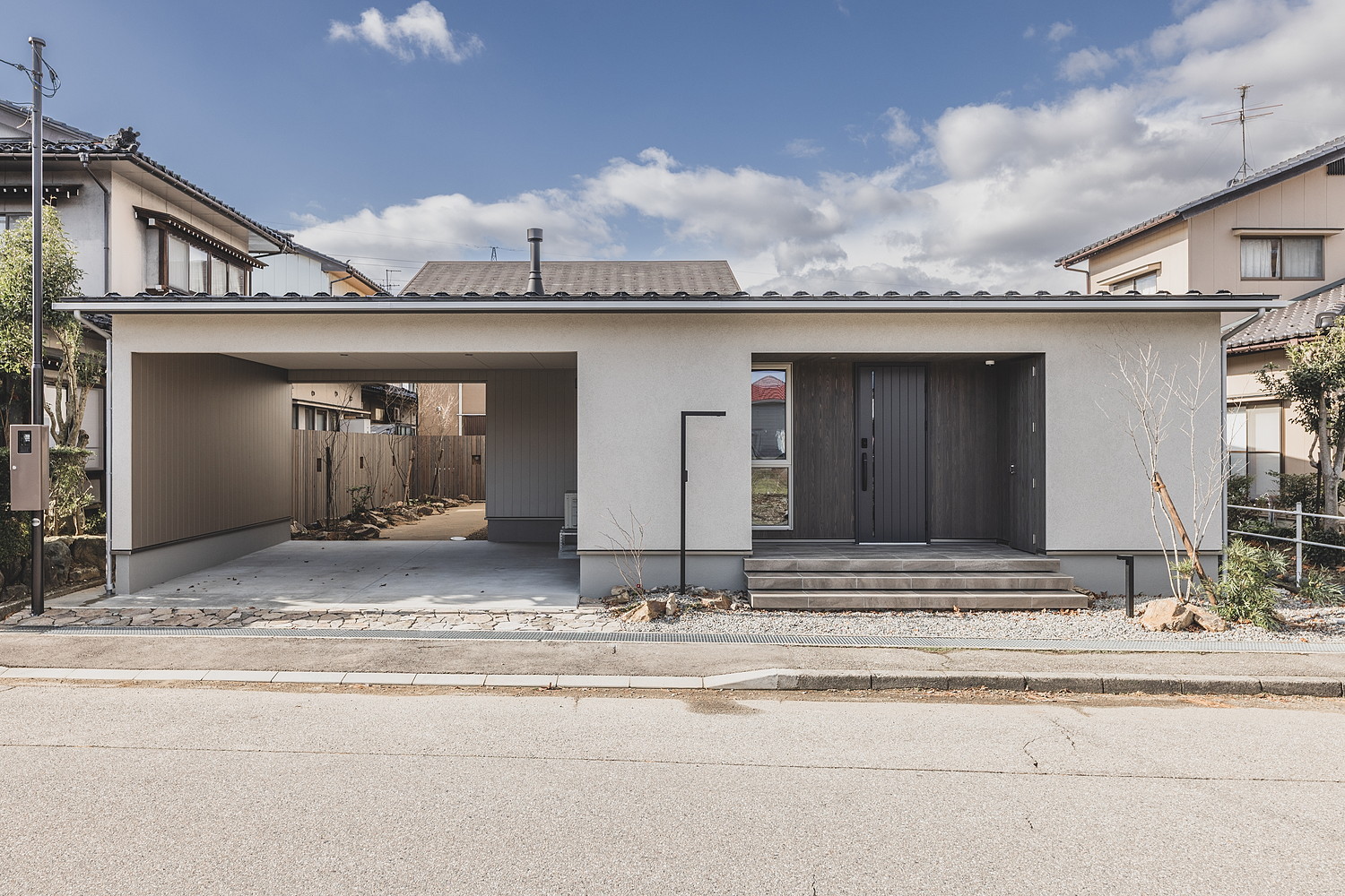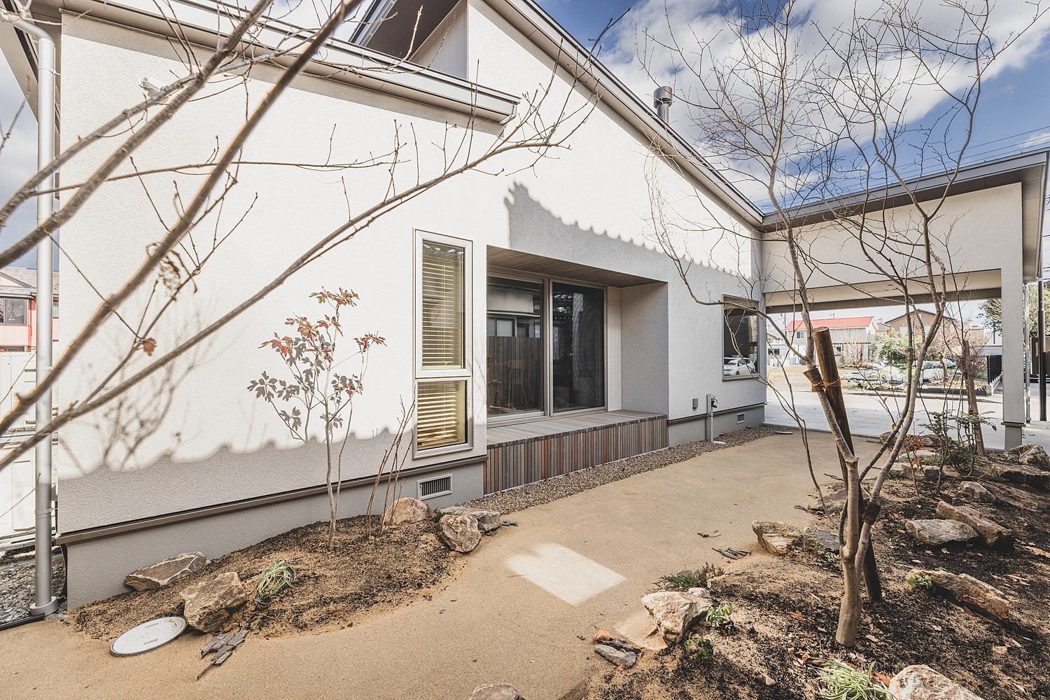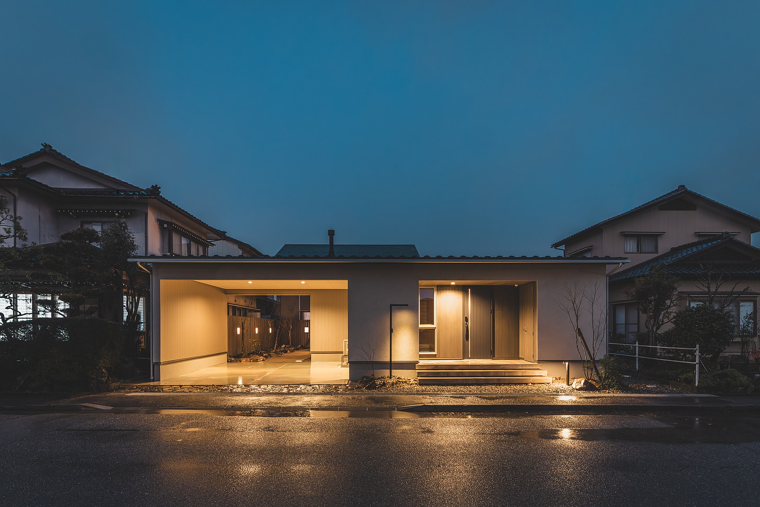 正面のファサードはジョリパット吹付で仕上げ、玄関ポーチ部分には温かみのある杉羽目板を張りました。側面にも同様の羽目板を施し、外部収納スペースとして実用性も兼ね備えています。広々としたエントランスには宅配ボックスも設置されており、インナーガレージから直接玄関へアクセスできる動線とあわせて、雨天時も濡れることなく荷物の受け取りや出入りが快適に行えます。夜になるとポーチと庭の照明が優しく灯り、昼間とはまた異なる表情を見せます。
