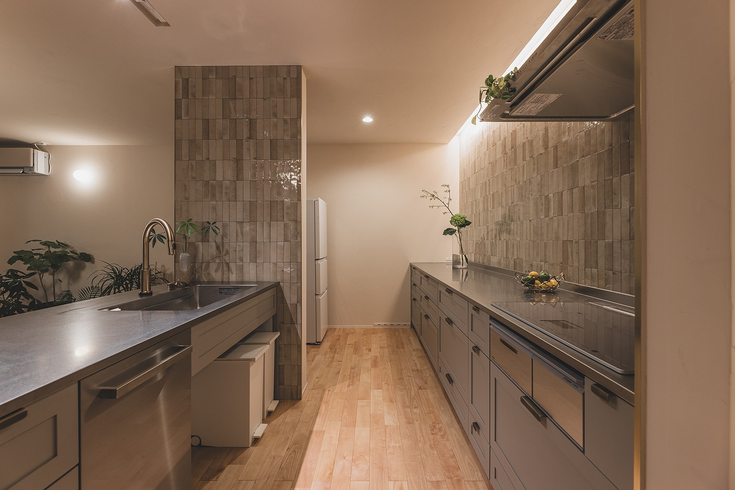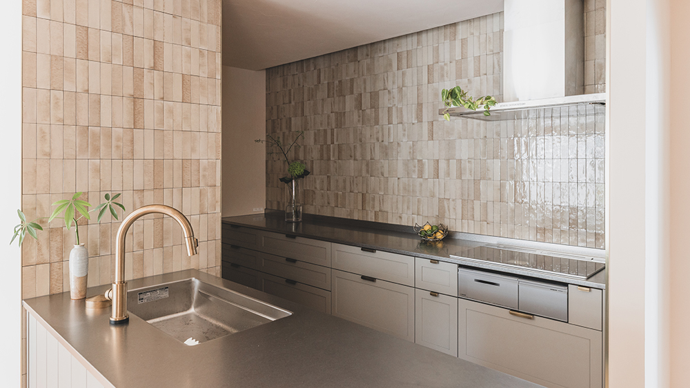 家族での料理やゲストを招いたパーティーにも対応できるⅡ型キッチンを採用。タイルの壁で仕切られた場所にパントリーを配置し、冷蔵庫や家電を収納。広々としたキッチンをすっきりと保ちます。